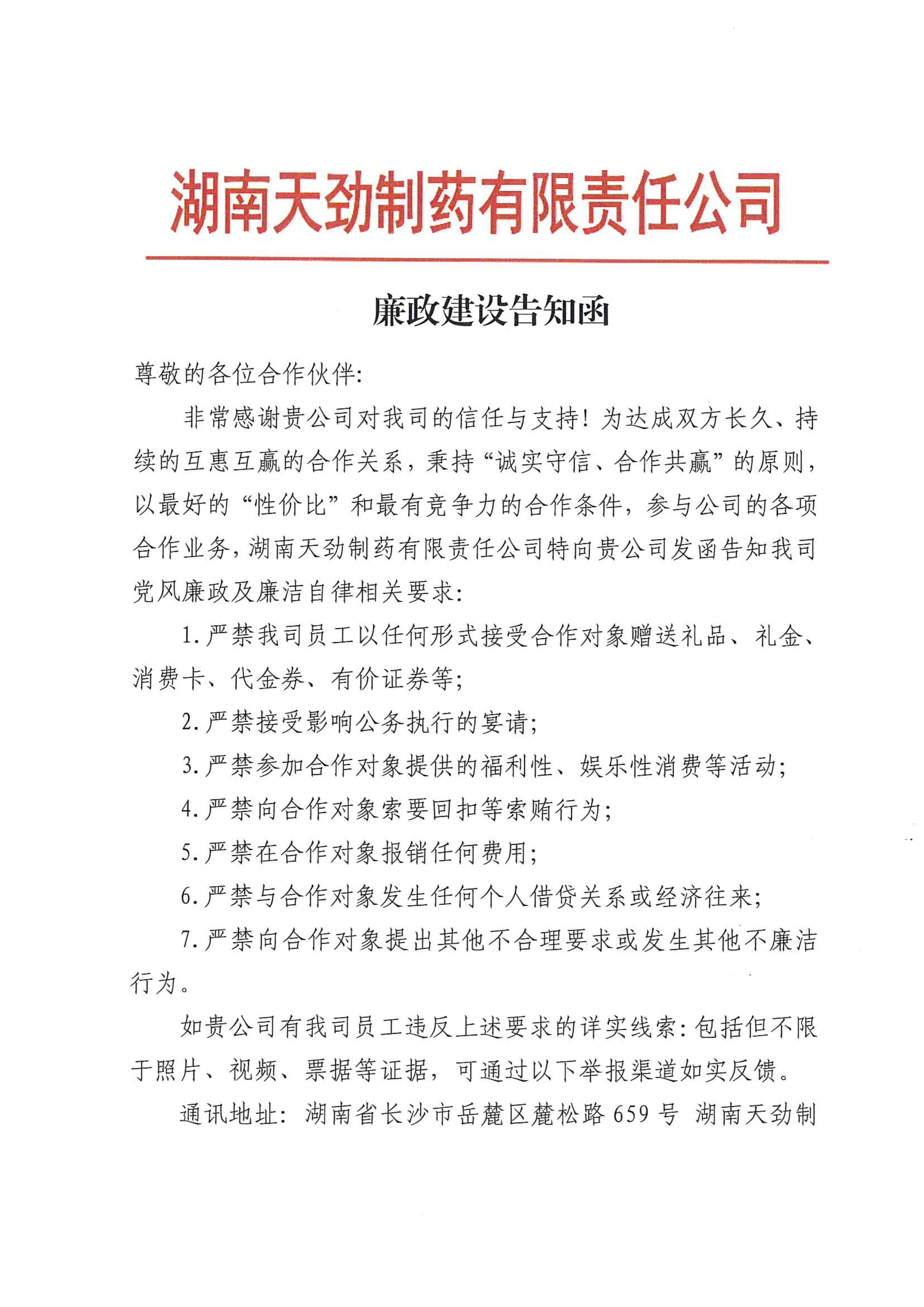 湖南天劲制药有限责任公司廉政建设告知函