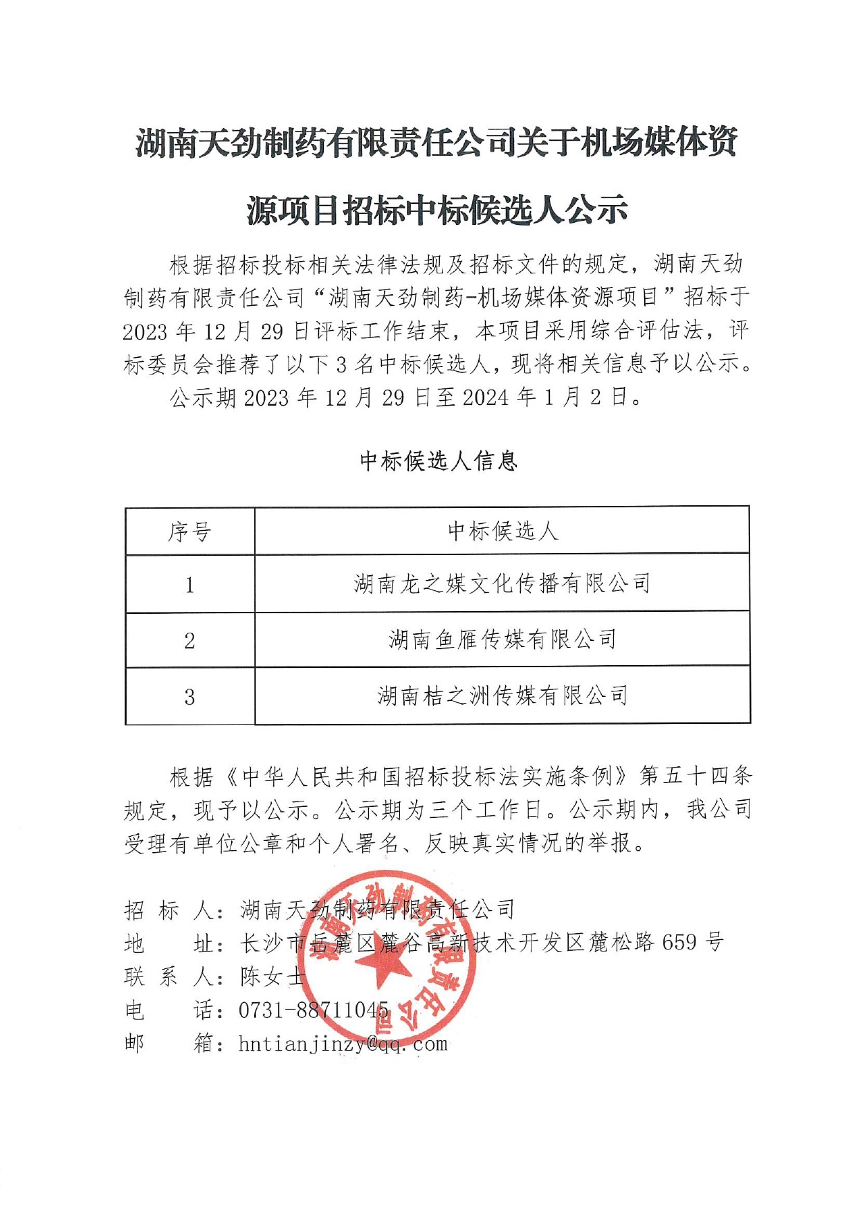 湖南天劲制药有限责任公司关于机场媒体资源项目招标中标候选人公示