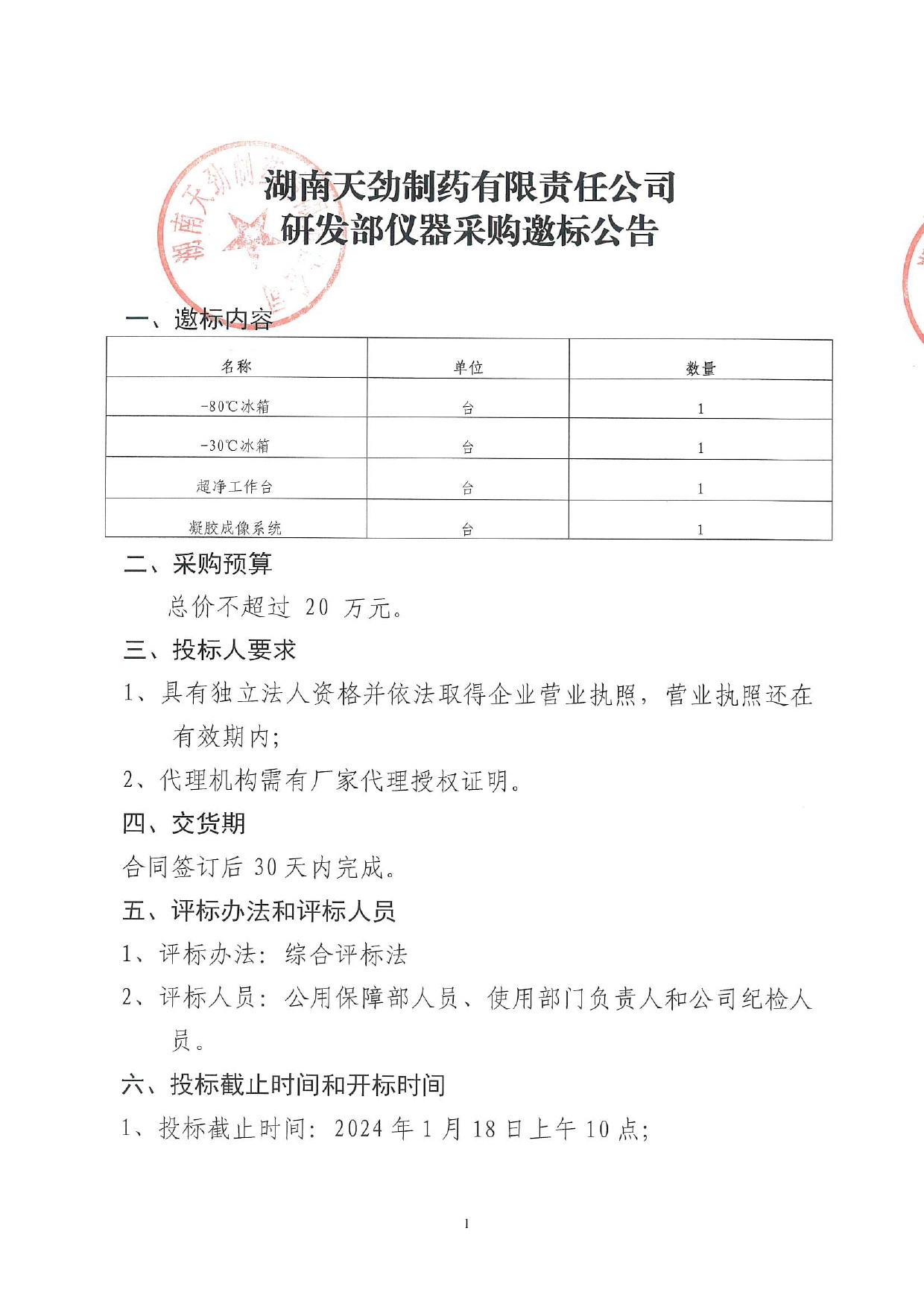 湖南天劲制药有限责任公司 研发部仪器采购邀标公告