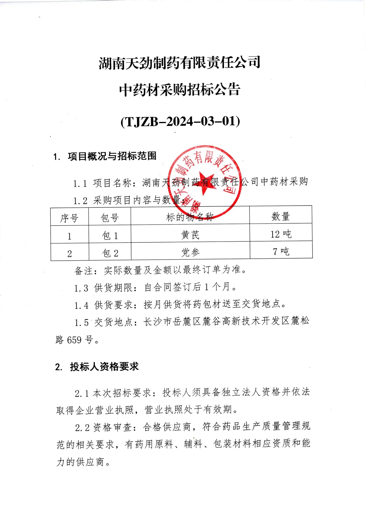湖南天劲制药有限责任公司中药材采购招标公告 (TJZB-2024-02-01)