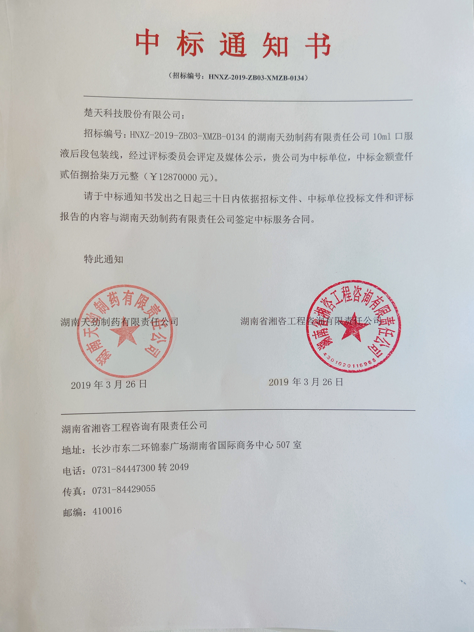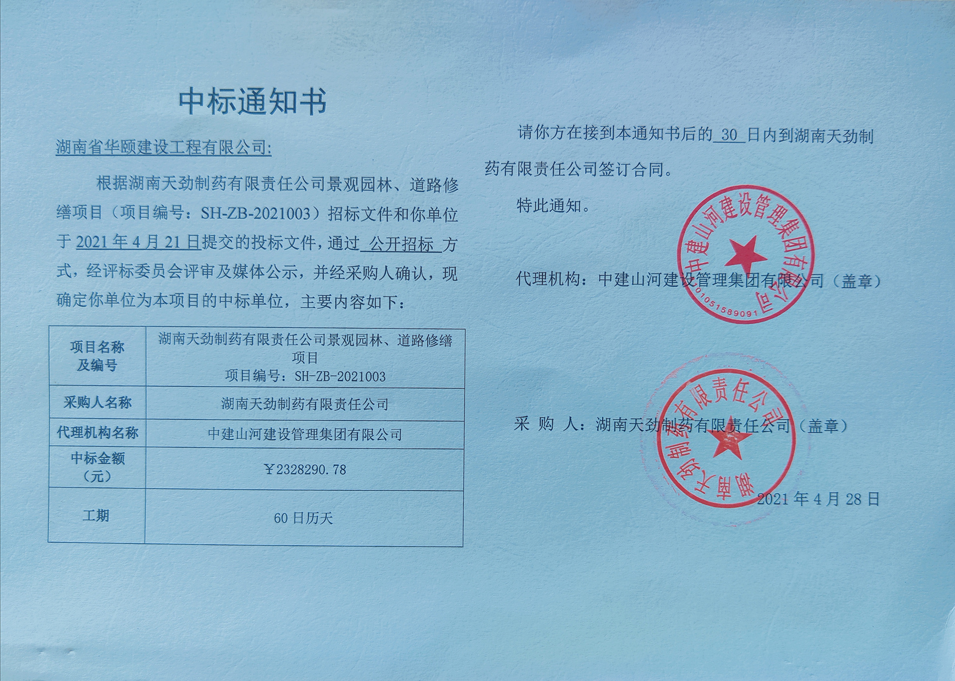 湖南天劲制药有限责任公司景观园林、道路修缮项目中标通知书