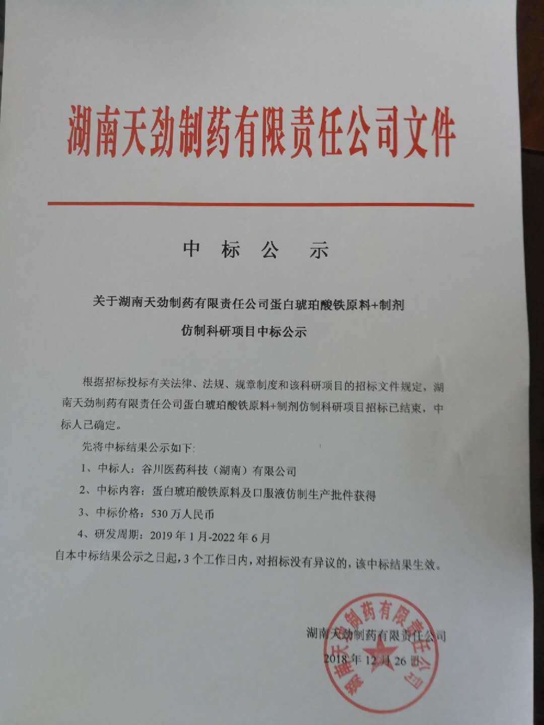 关于湖南天劲制药有限责任公司蛋白琥珀酸铁原料+制剂仿制科研项目中标公示