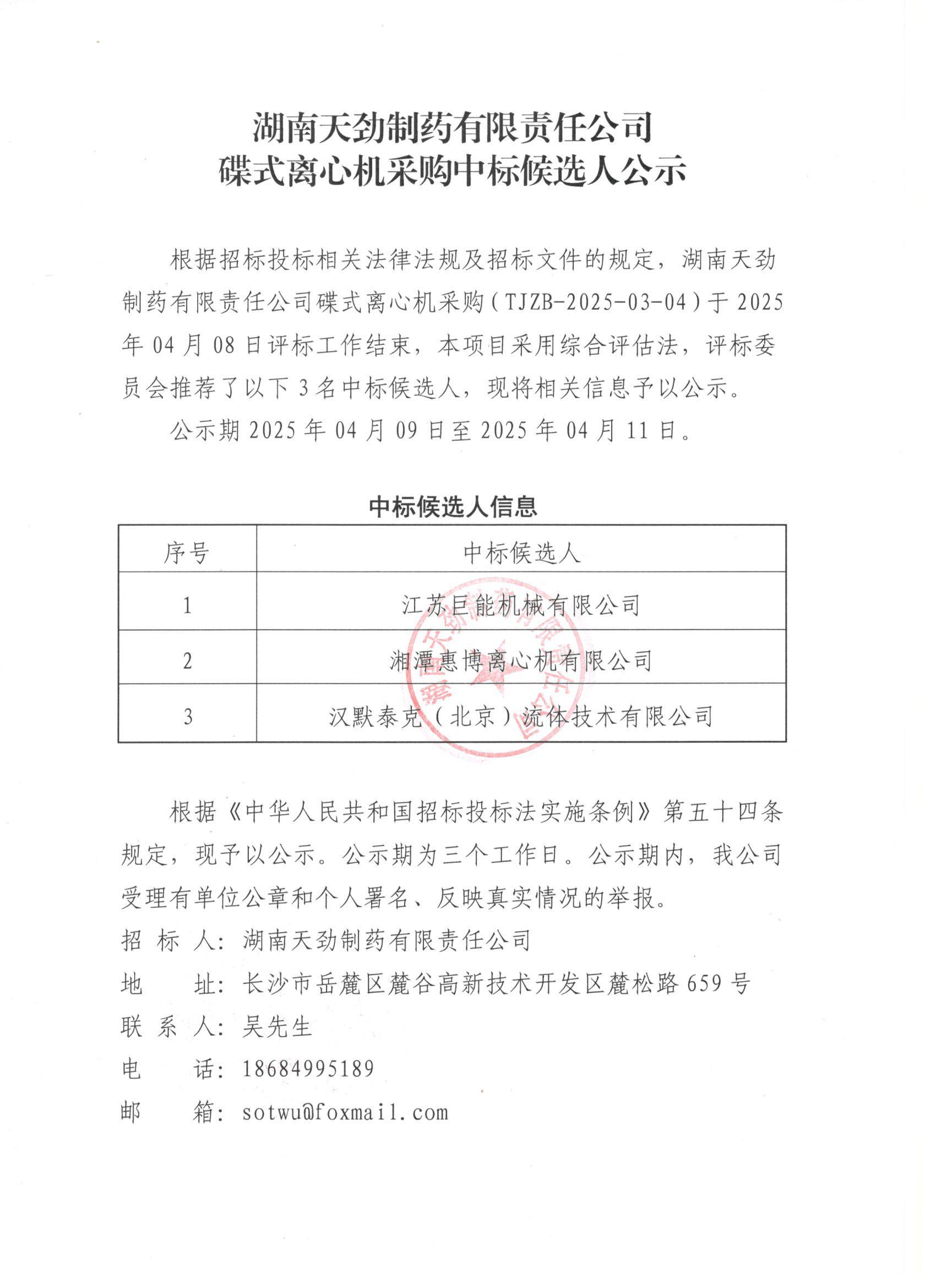 湖南天劲制药有限责任公司碟式离心机采购中标候选人公示