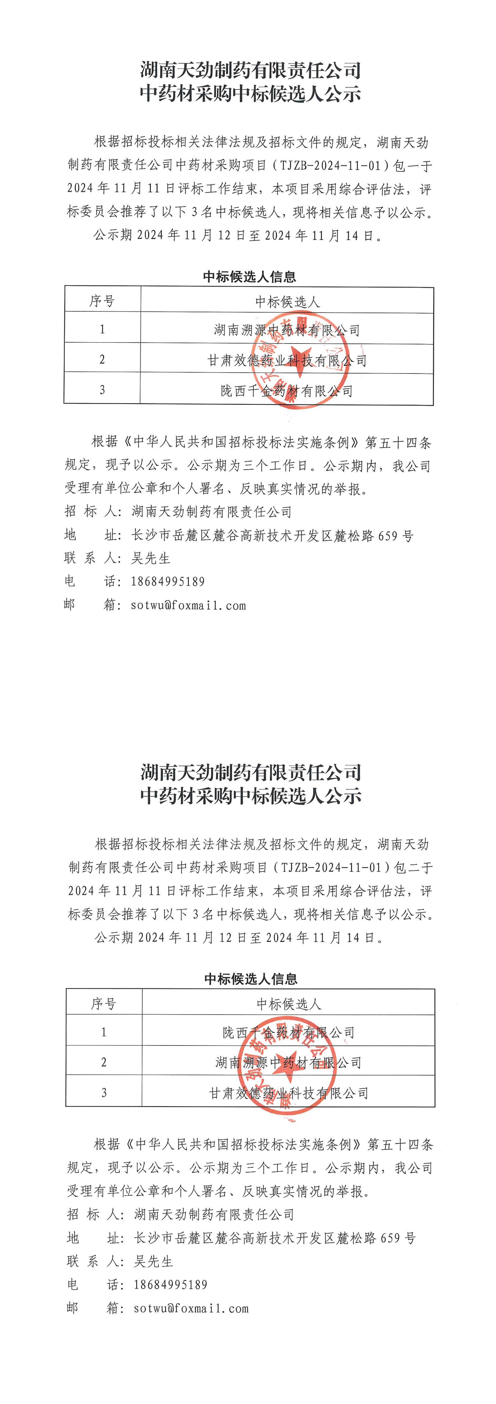 湖南天劲制药有限责任公司中药采购中标候选人公示