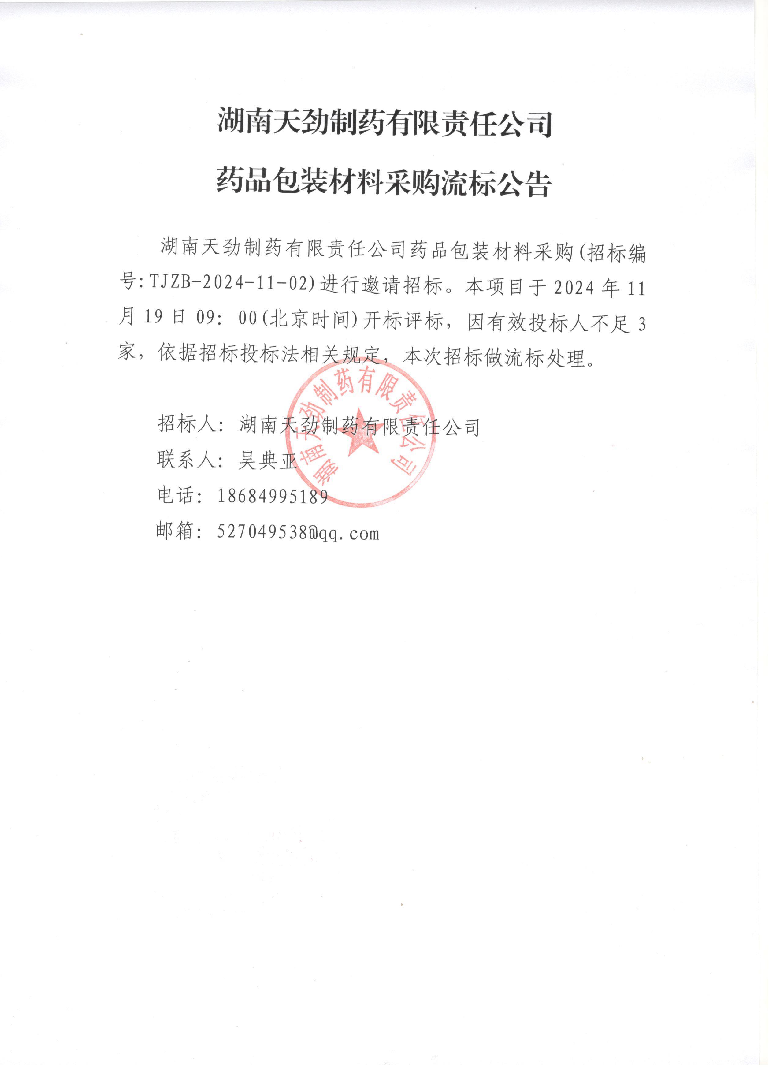 湖南天劲制药有限责任公司药品包装材料采购流标公示