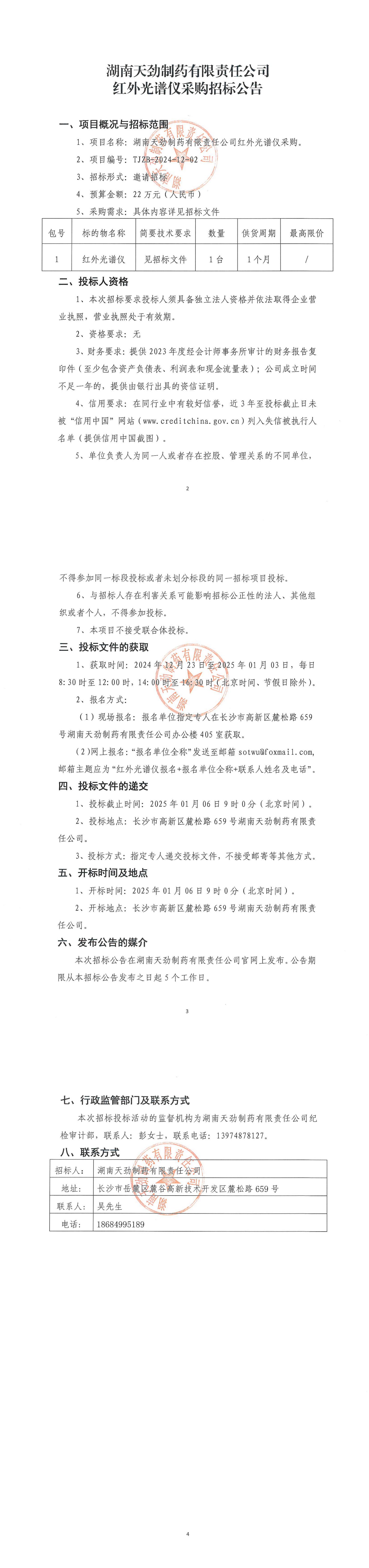 湖南天劲制药有限责任公司红外光谱仪采购招标公示