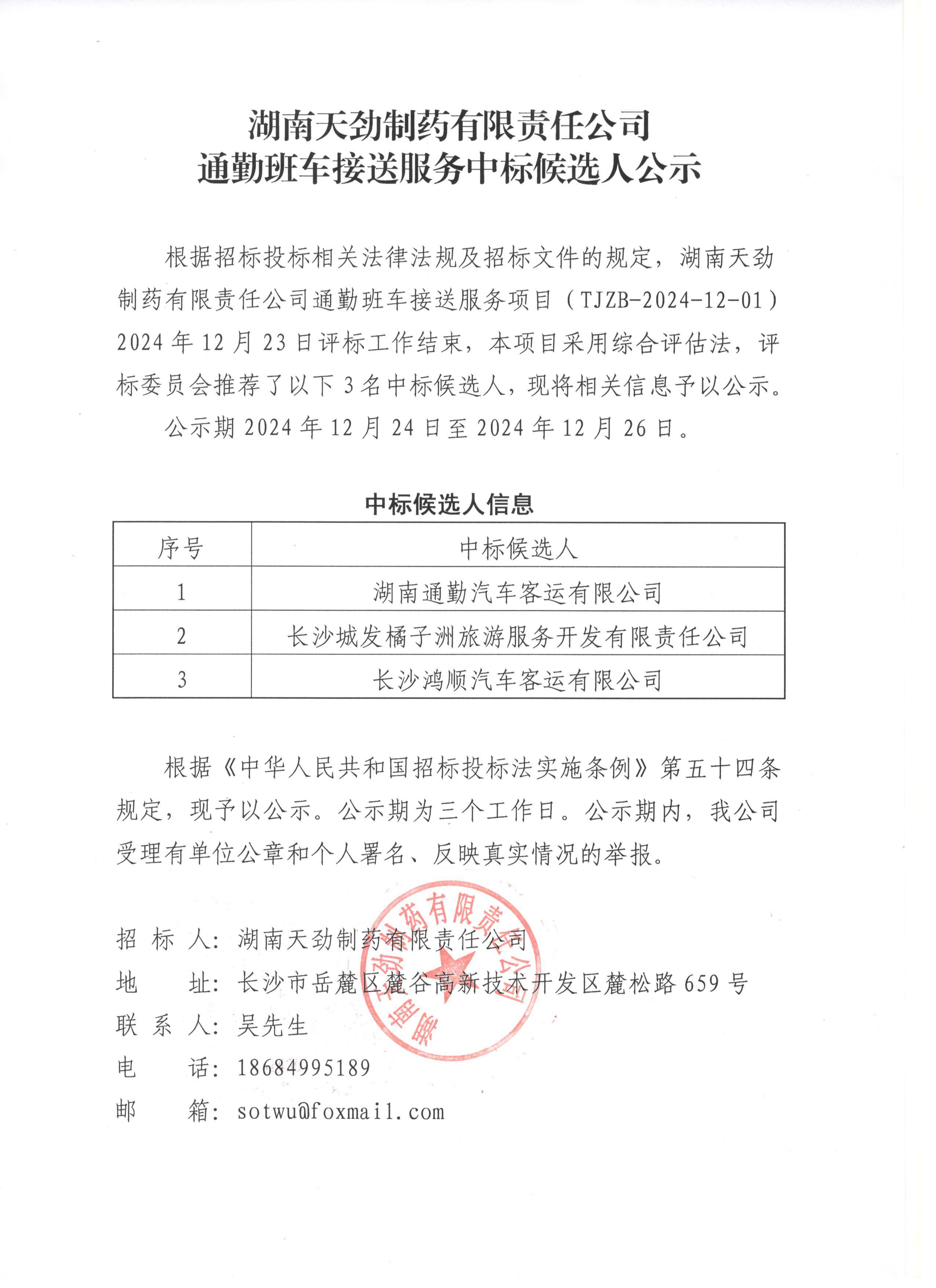 湖南天劲制药有限责任公司通勤班车接送服务中标候选人公示