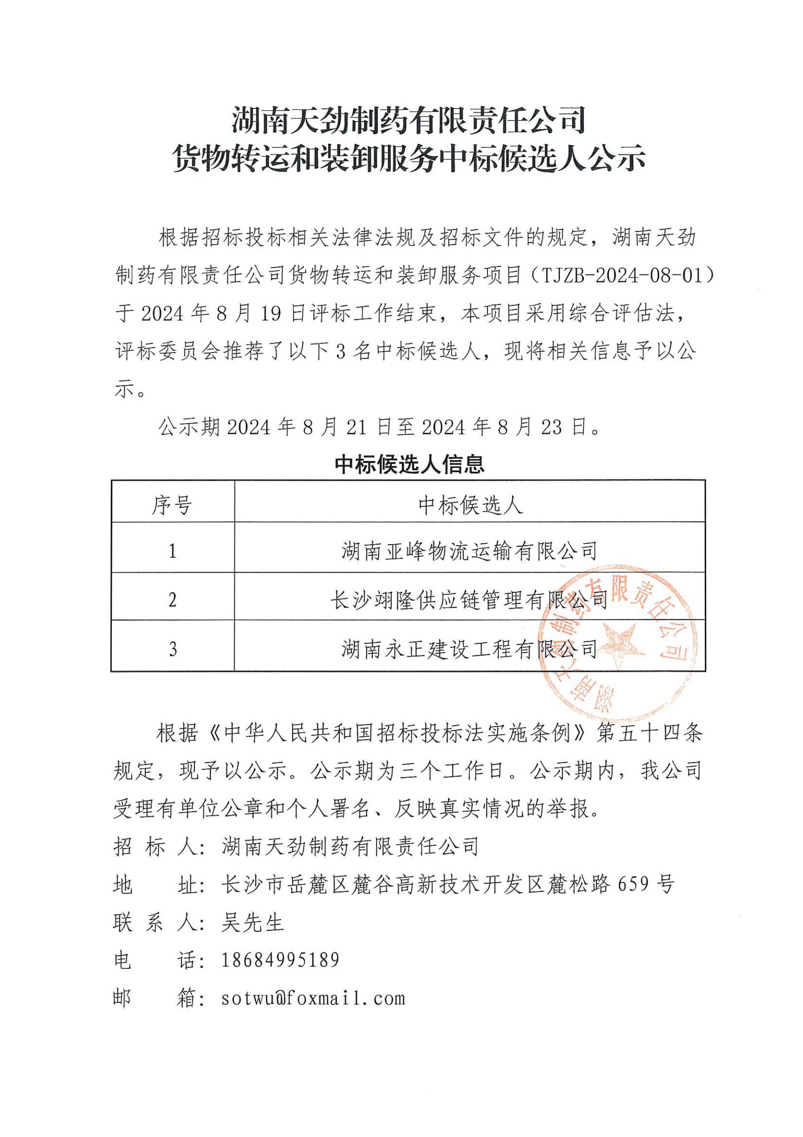 湖南天劲制药有限责任公司货物转运和装卸服务中标候选人公示