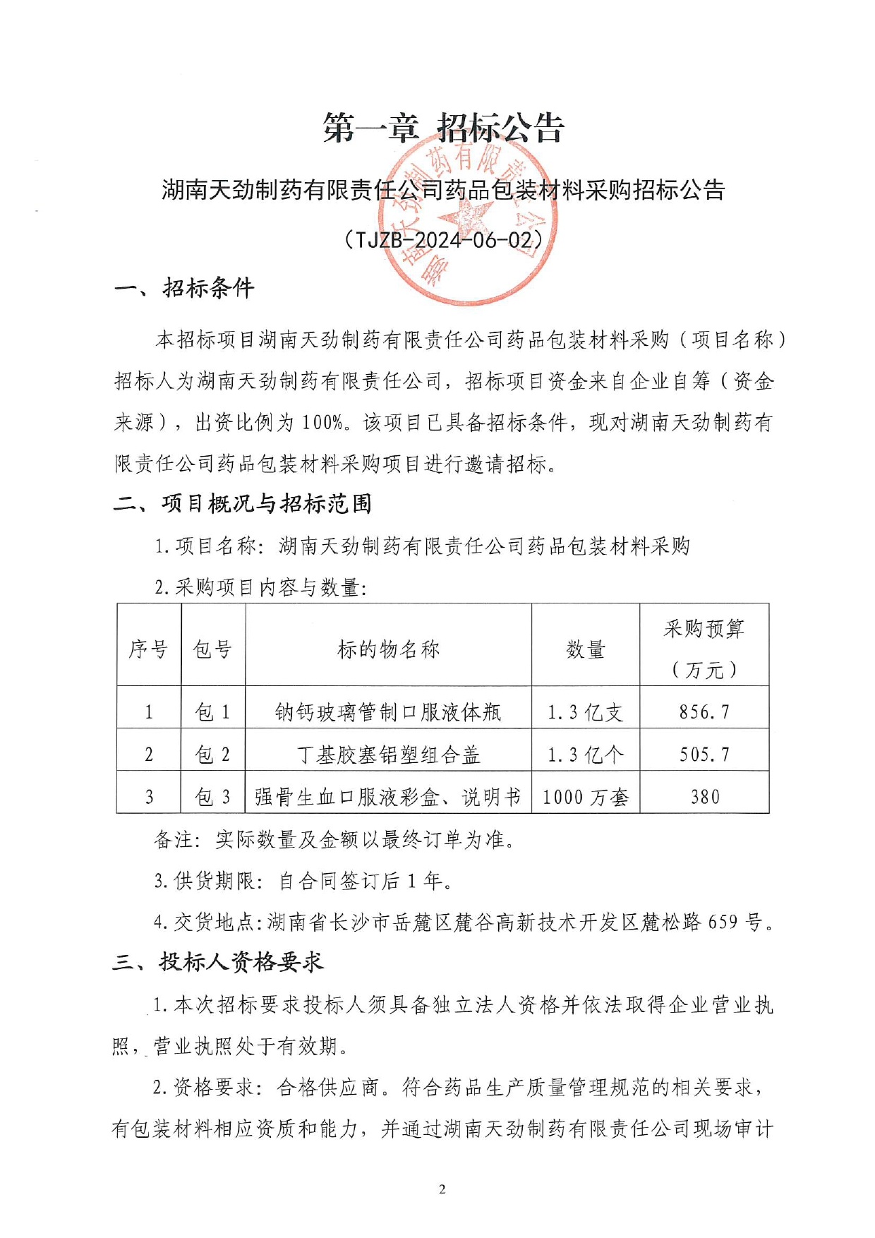 湖南天劲制药有限责任公司药品包装材料采购招标公告