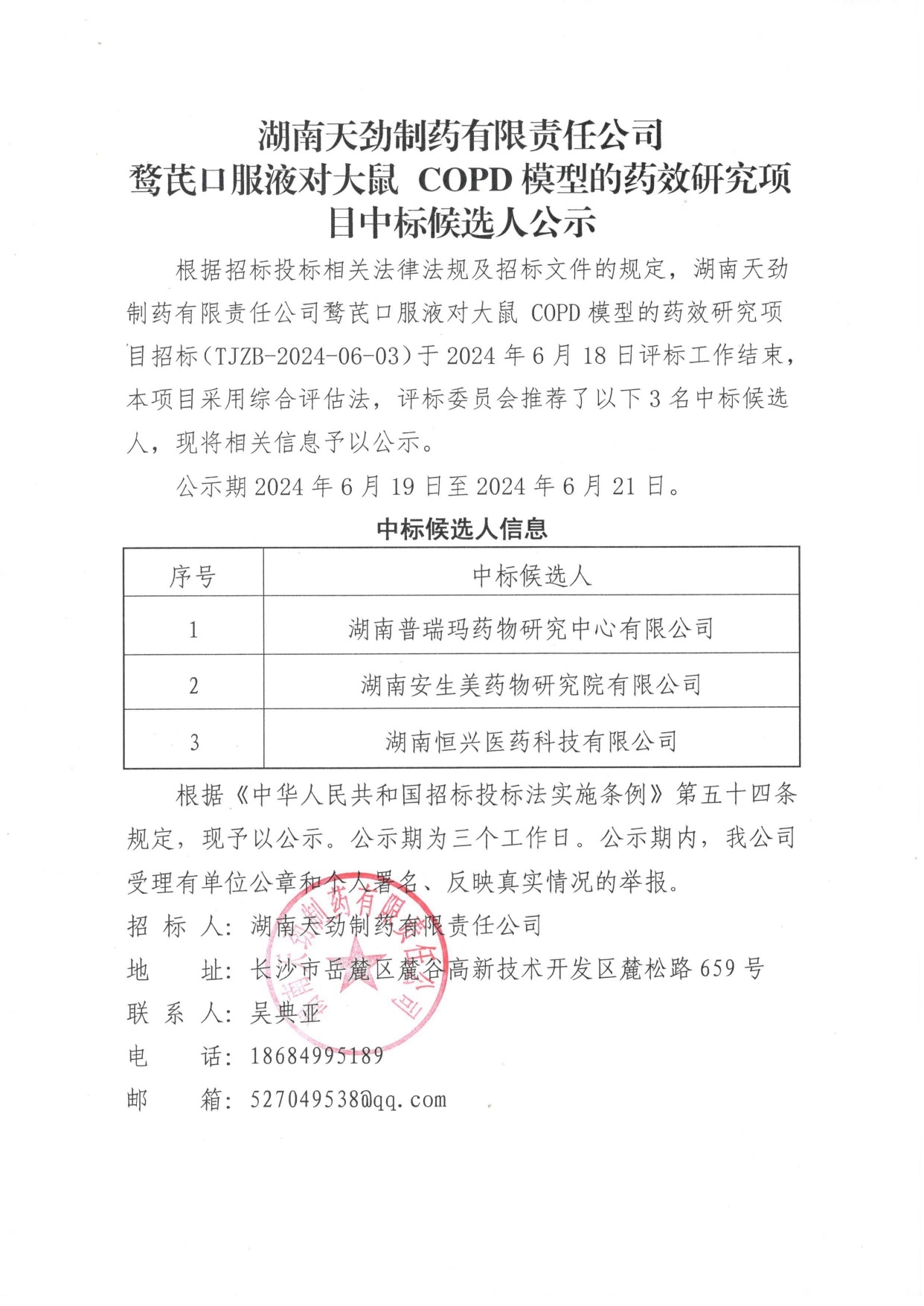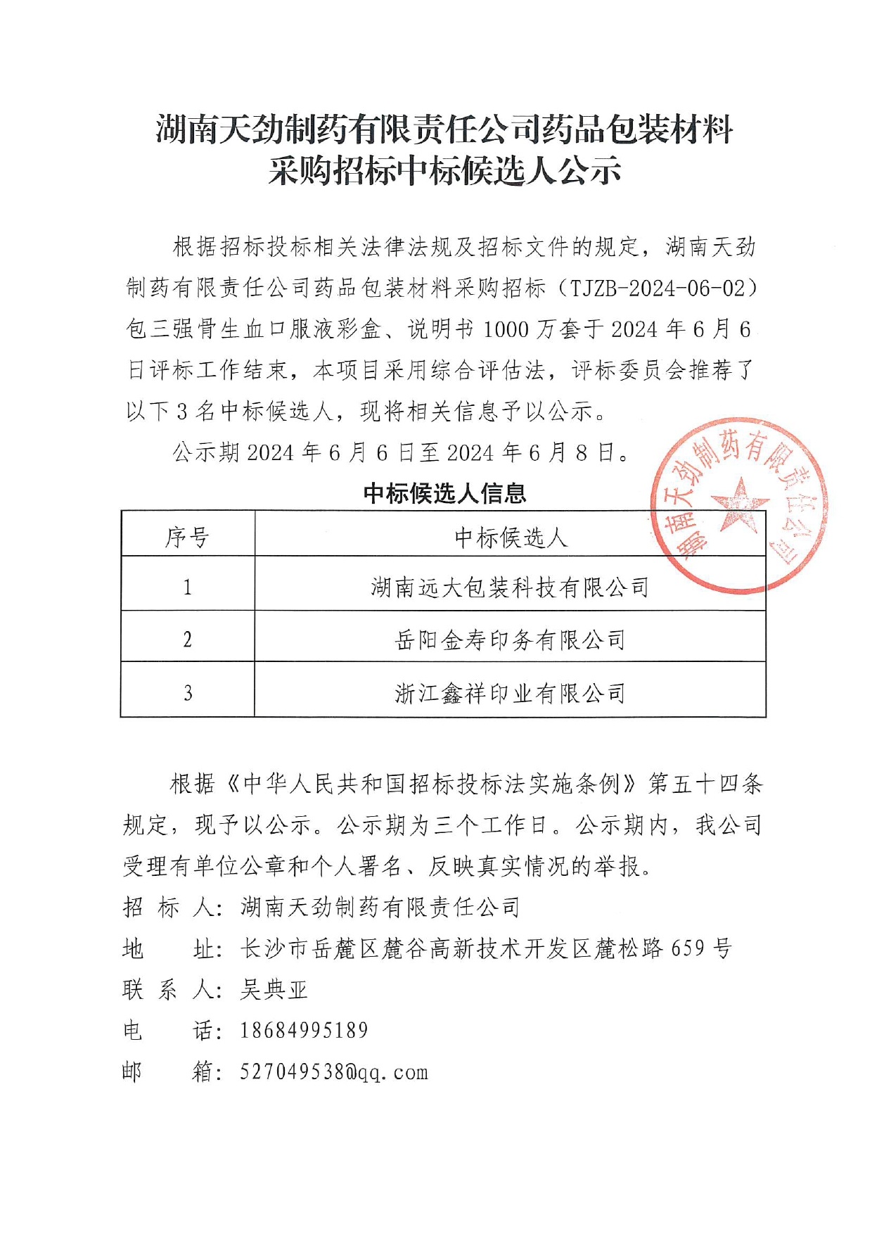 湖南天劲制药有限责任公司药品包装材料采购招标中标候选人公示