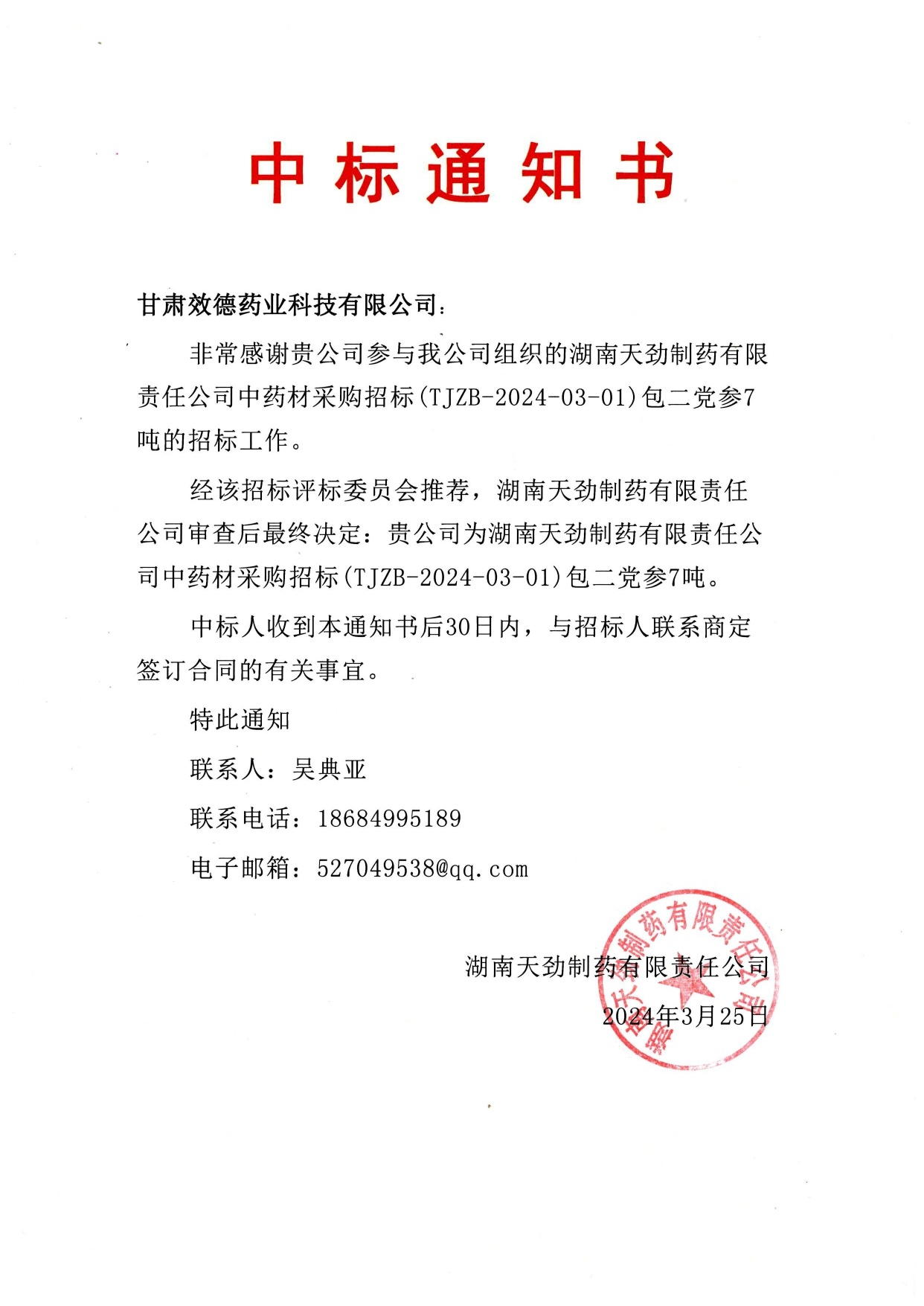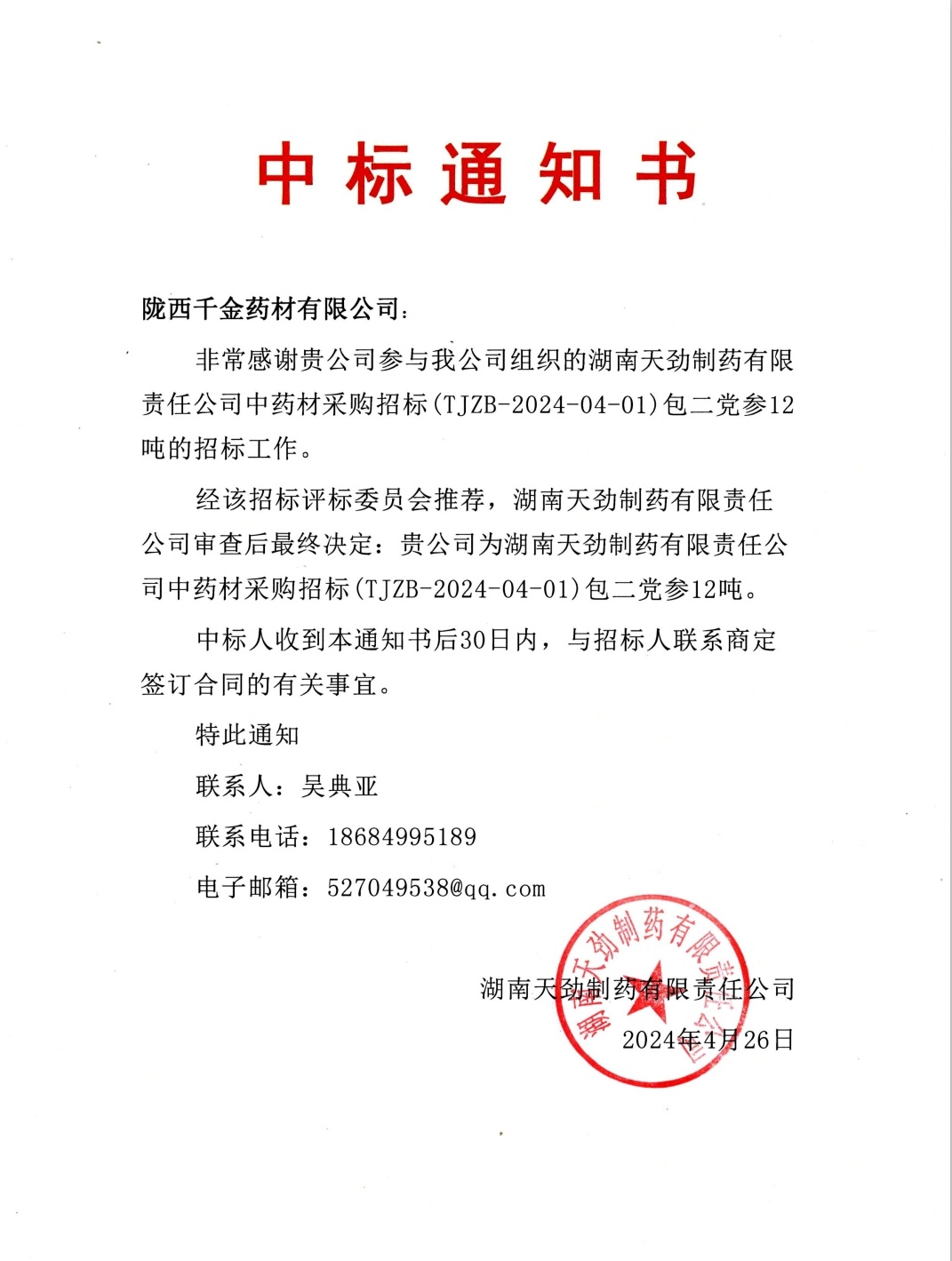 湖南天劲制药有限责任公司中药材采购招标公告 (TJZB-2024-04-01)