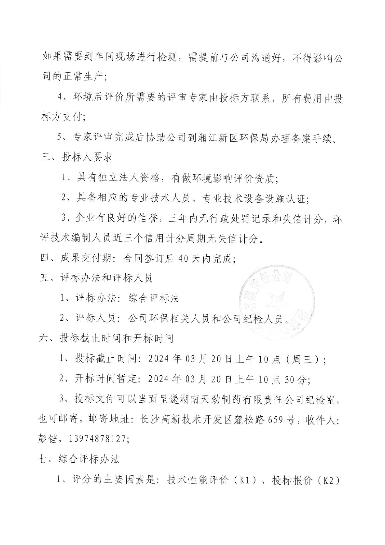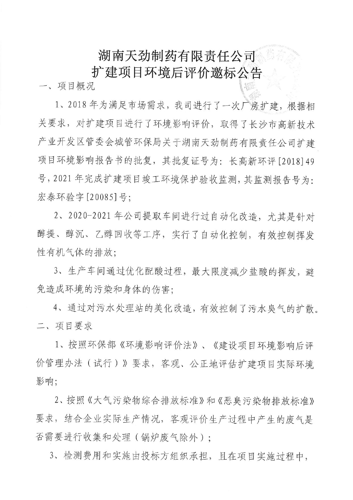 湖南天劲制药有限责任公司扩建项目环境后评价邀标公告