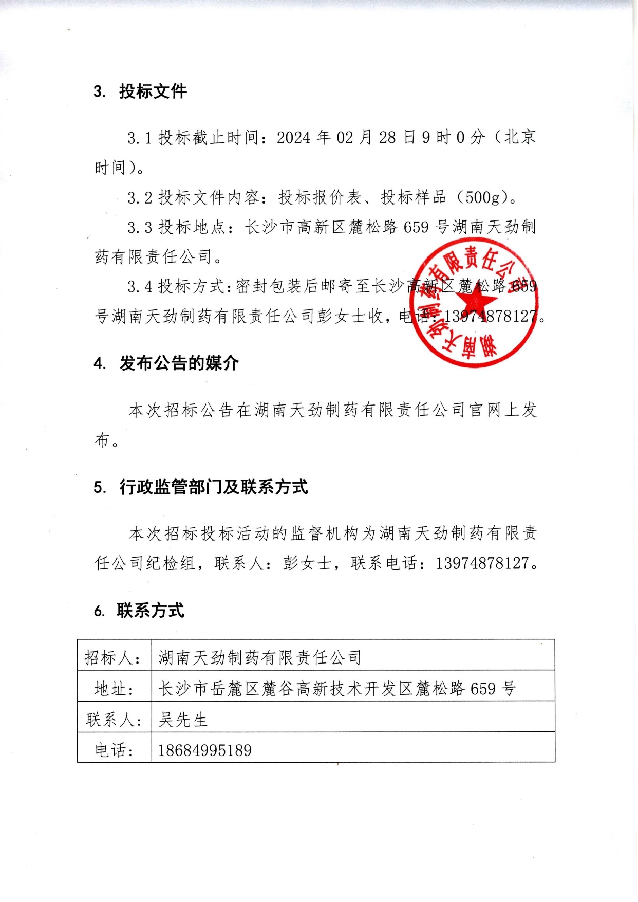 湖南天劲制药有限责任公司中药材采购招标公告 (TJZB-2024-02-01)