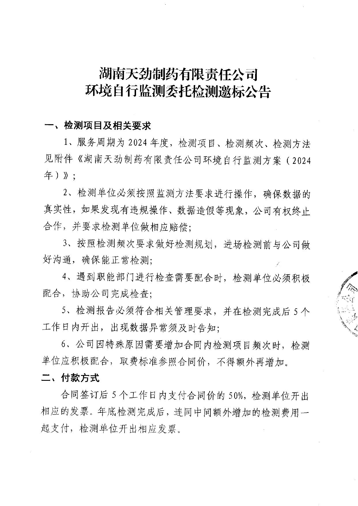 湖南天劲制药有限责任公司环境自行监测委托检测邀标公告