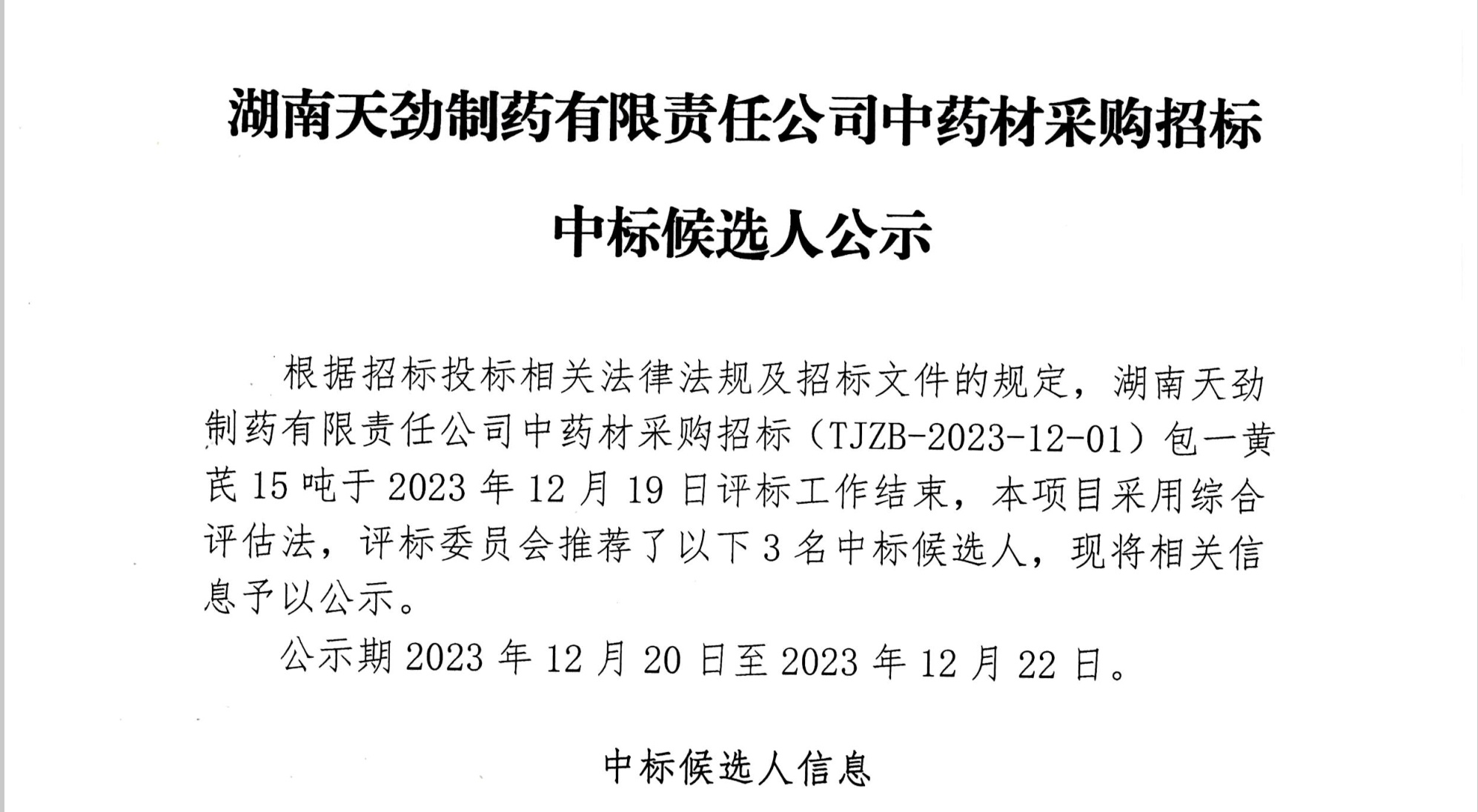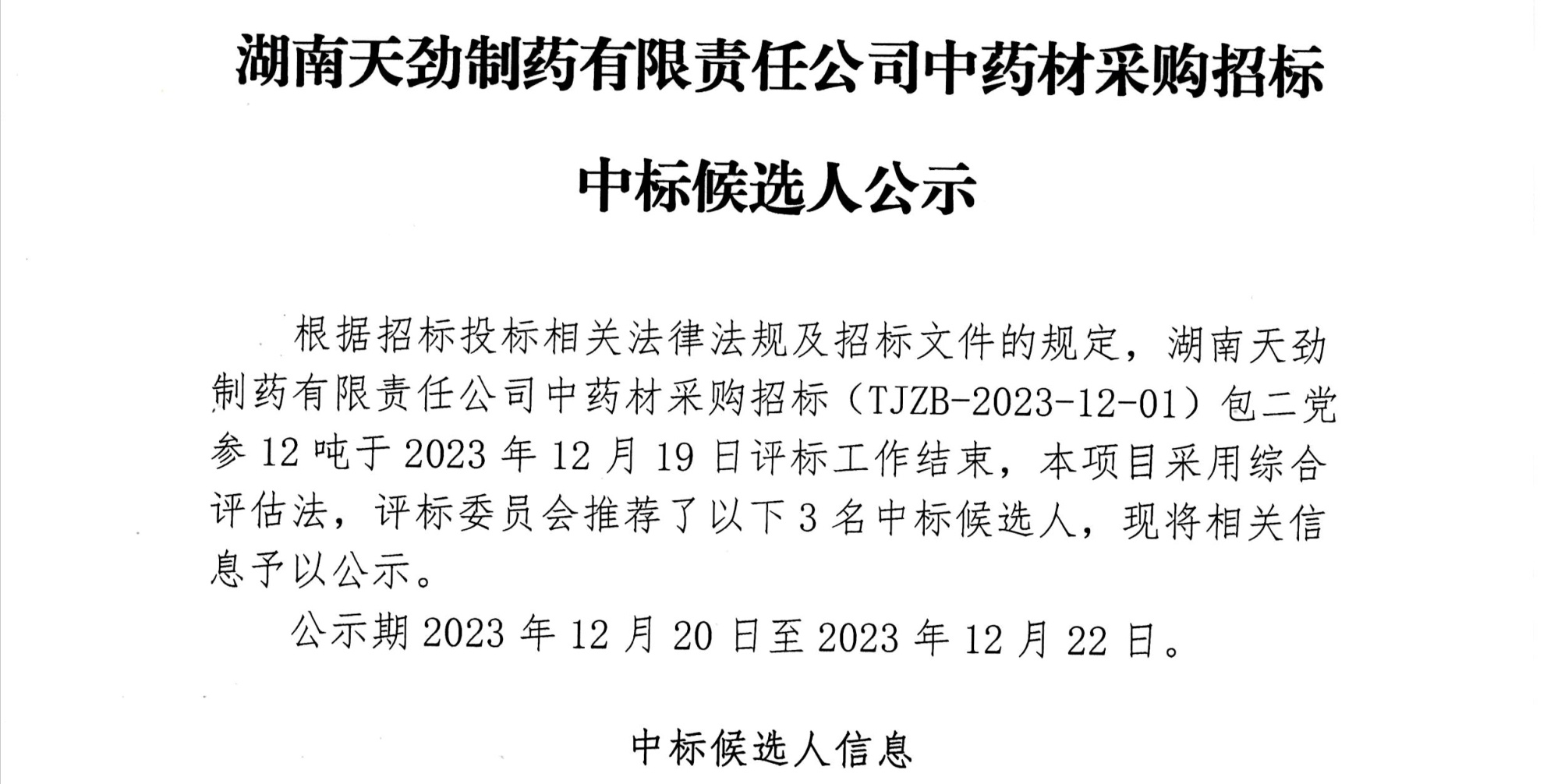 湖南天劲制药有限责任公司中药材采购招标公告((TJZB-2023-12-01))