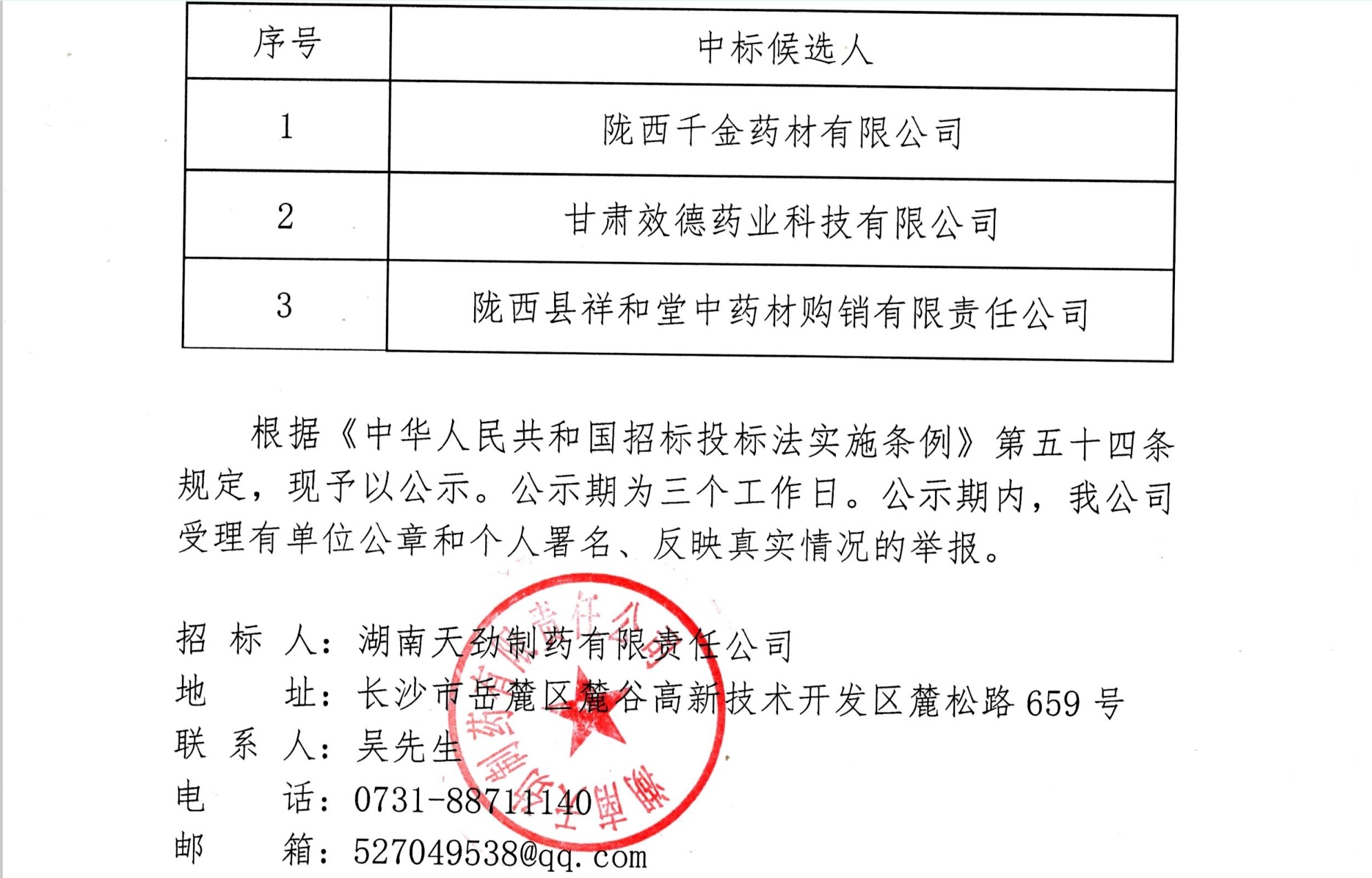 中药材采购招标中标候选人公示