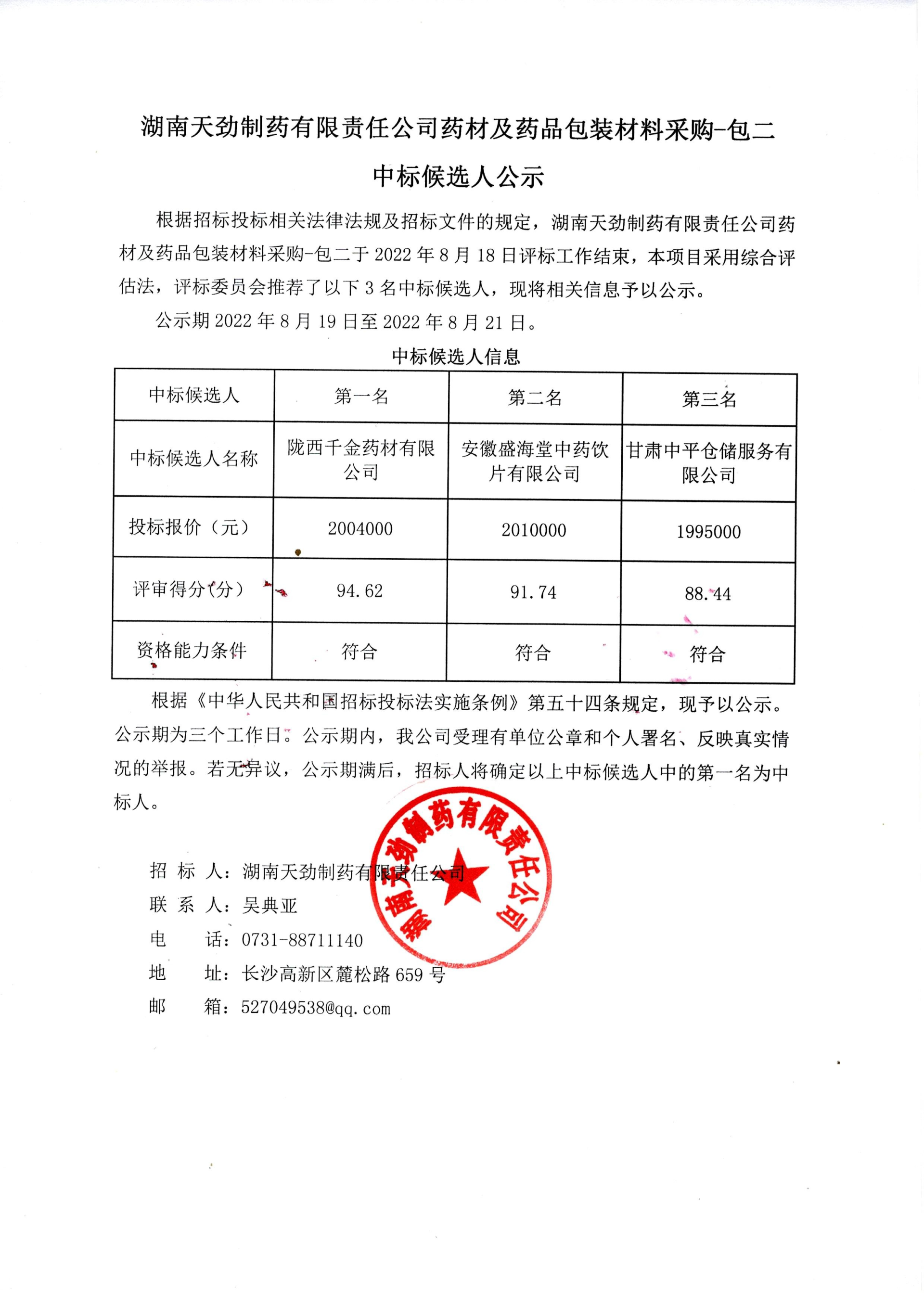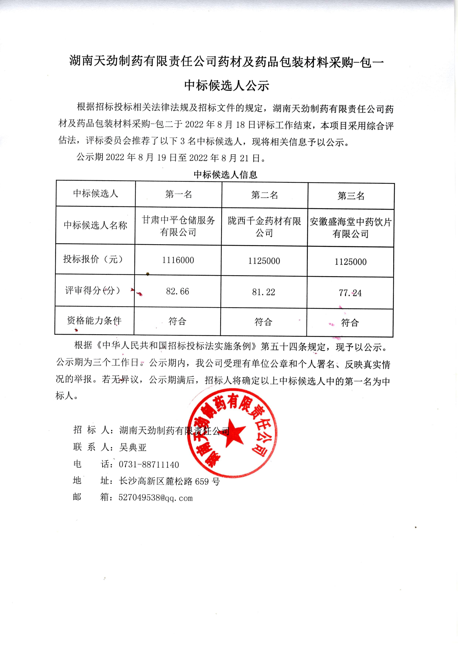 湖南天劲制药有限责任公司药材及药品包装材料采购中标候选人公示