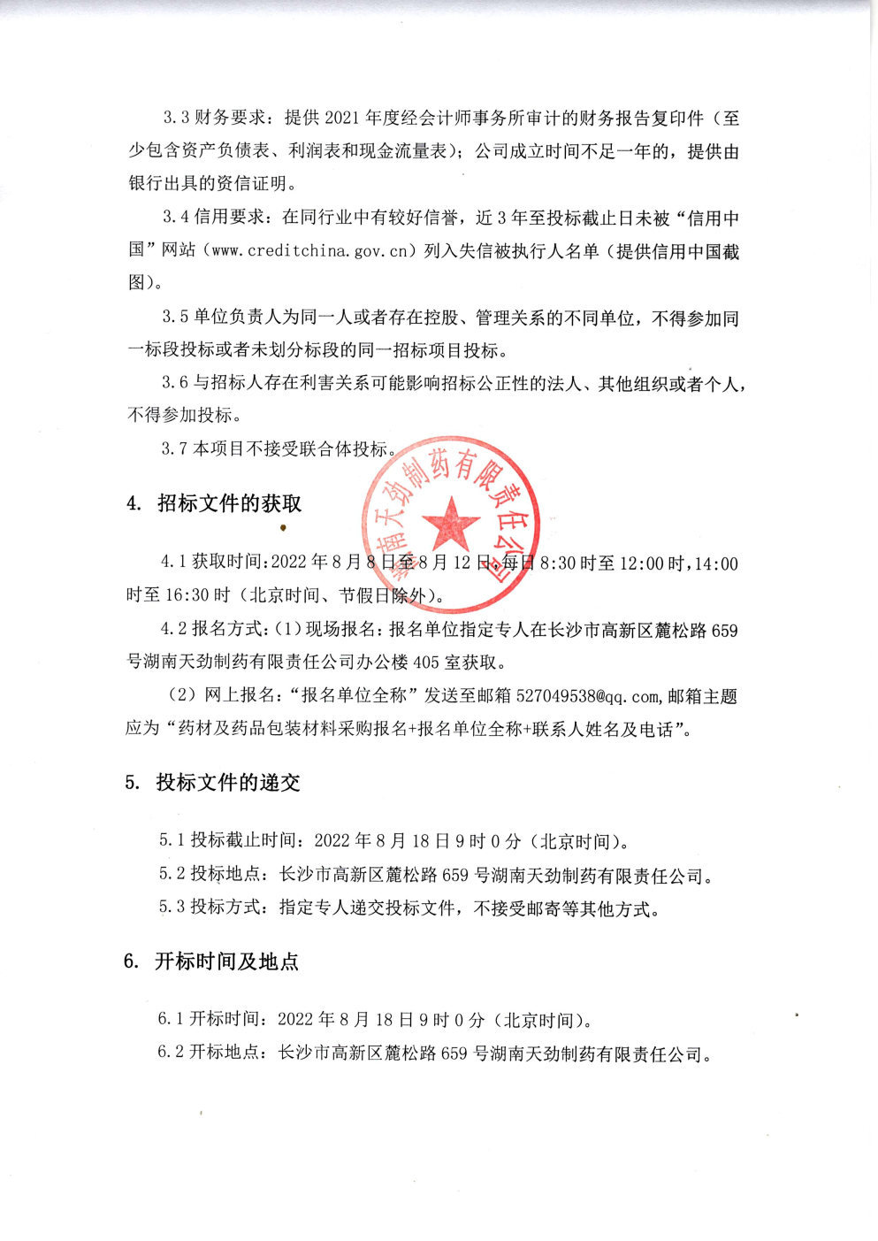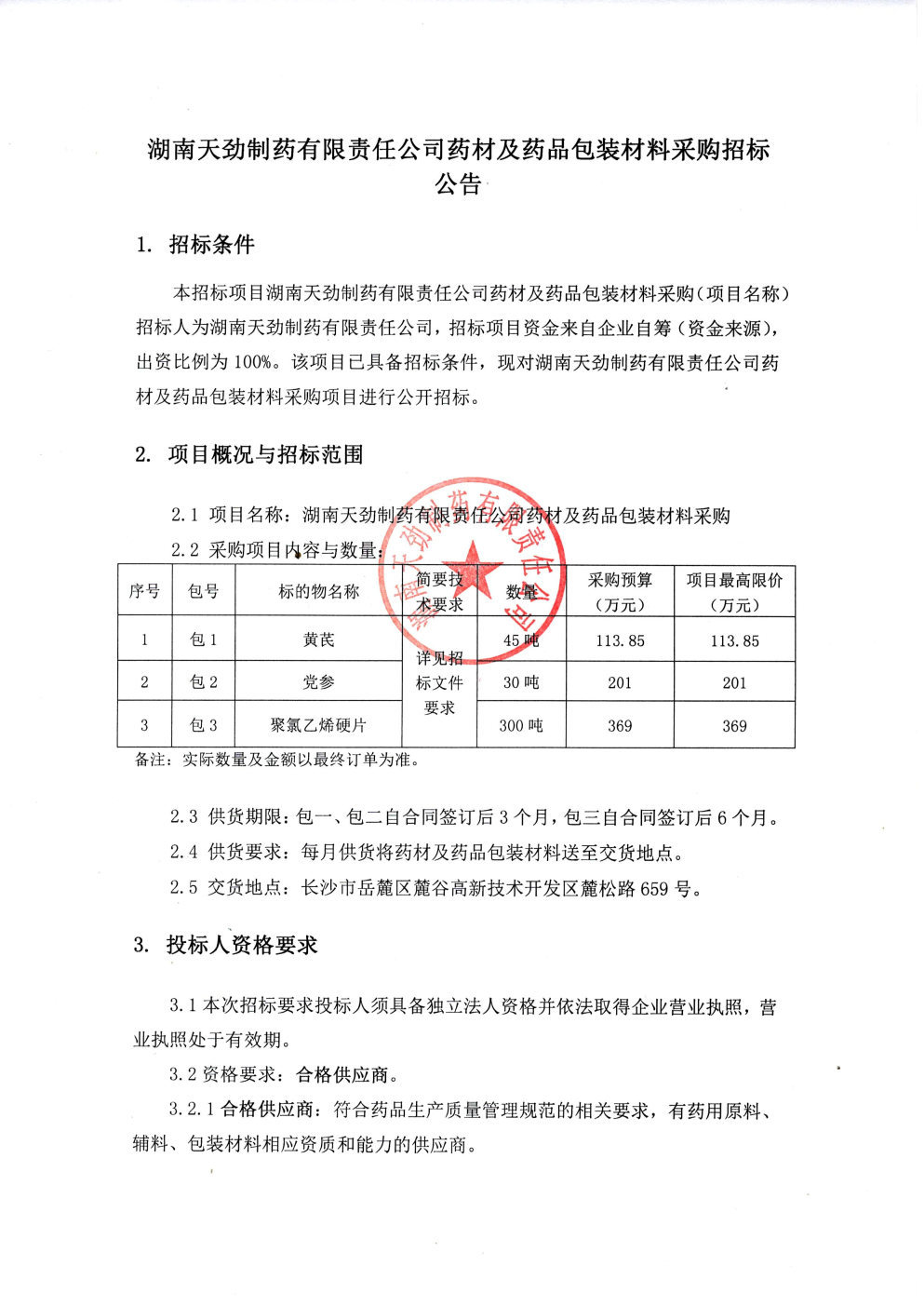 湖南天劲制药有限责任公司药材及药品包装材料采购招标公告