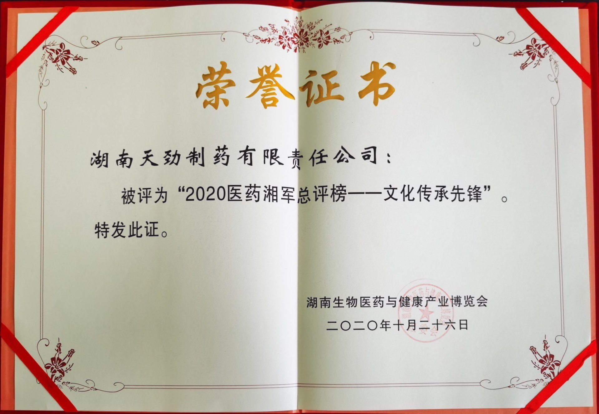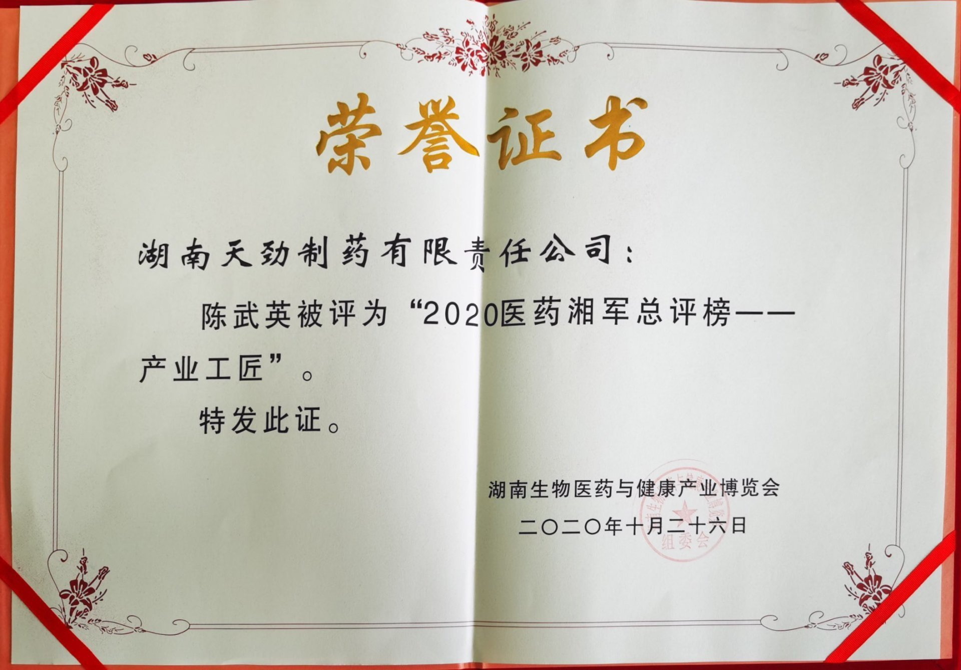 本届博览会突出节约、绿色、创新的理念,在现场设置了沙龙论坛,专家学者、行业大咖面对面交流,为湖南中医药产业抢抓机遇献计献策。大会期间还进行了“2020医药湘军品牌榜”颁奖活动,对生物医药领域做出突出贡献的优秀企业和个人进行了表彰。天劲制药荣获2020“医药湘军总评榜”文化传承先锋称号、公司核心产品强骨生血口服液获“明星单品”奖;天劲制药生产部经理陈武英获产业工匠奖。