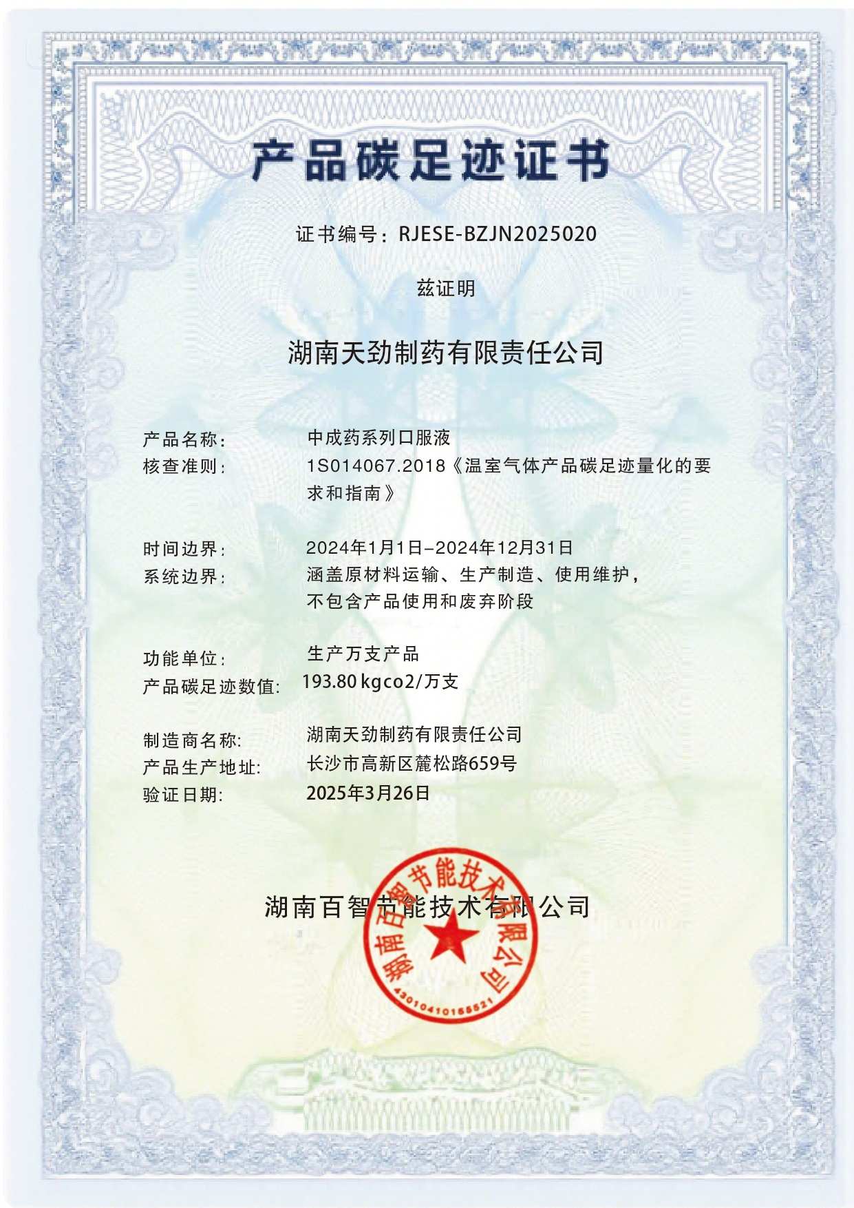 湖南天劲制药有限责任公司产品碳足迹证书