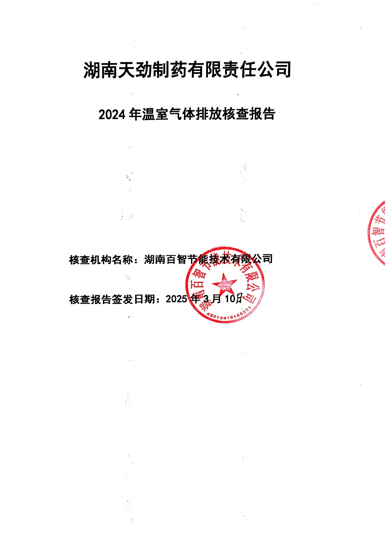 湖南天劲制药有限责任公司 2024 年温室气体排放核查报告