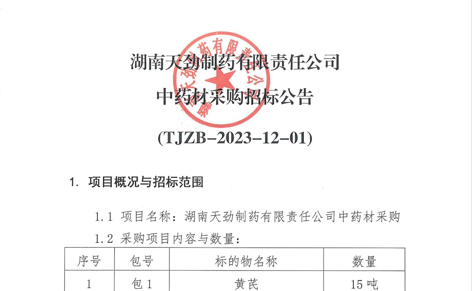 湖南天劲制药有限责任公司中药材采购招标公告((TJZB-2023-12-01))