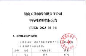 湖南天劲制药有限责任公司中药材采购招标公告 (TJZB-2023-08-01)