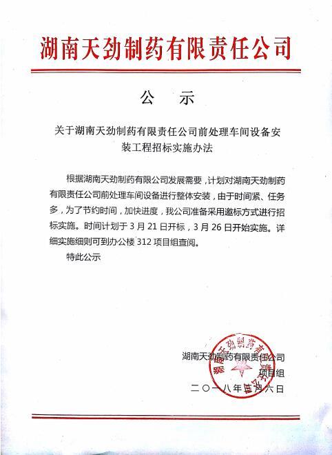 关于湖南天劲制药有限责任公司前处理车间设备安装工程招标实施办法
