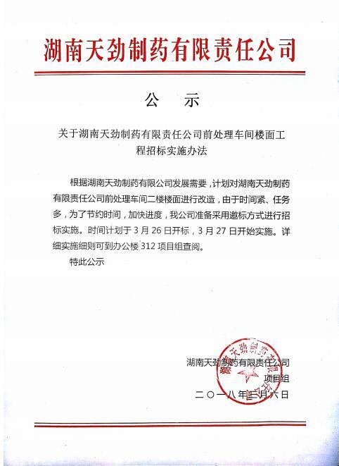 关于湖南天劲制药有限责任公司前处理车间楼面工程招标实施办法