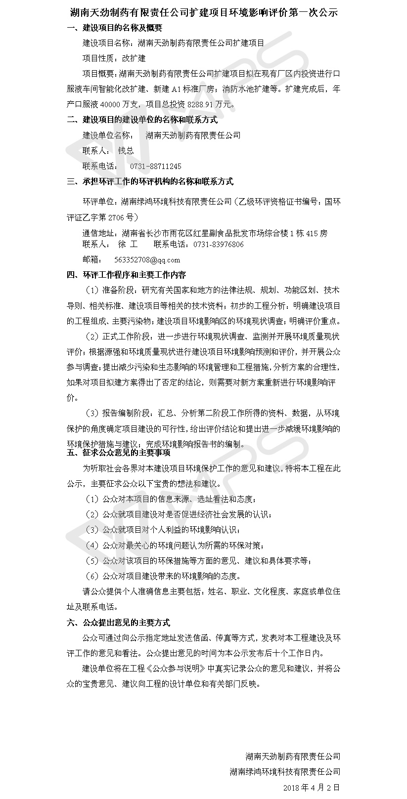 湖南天劲制药有限责任公司扩建项目环境影响评价第一次公示