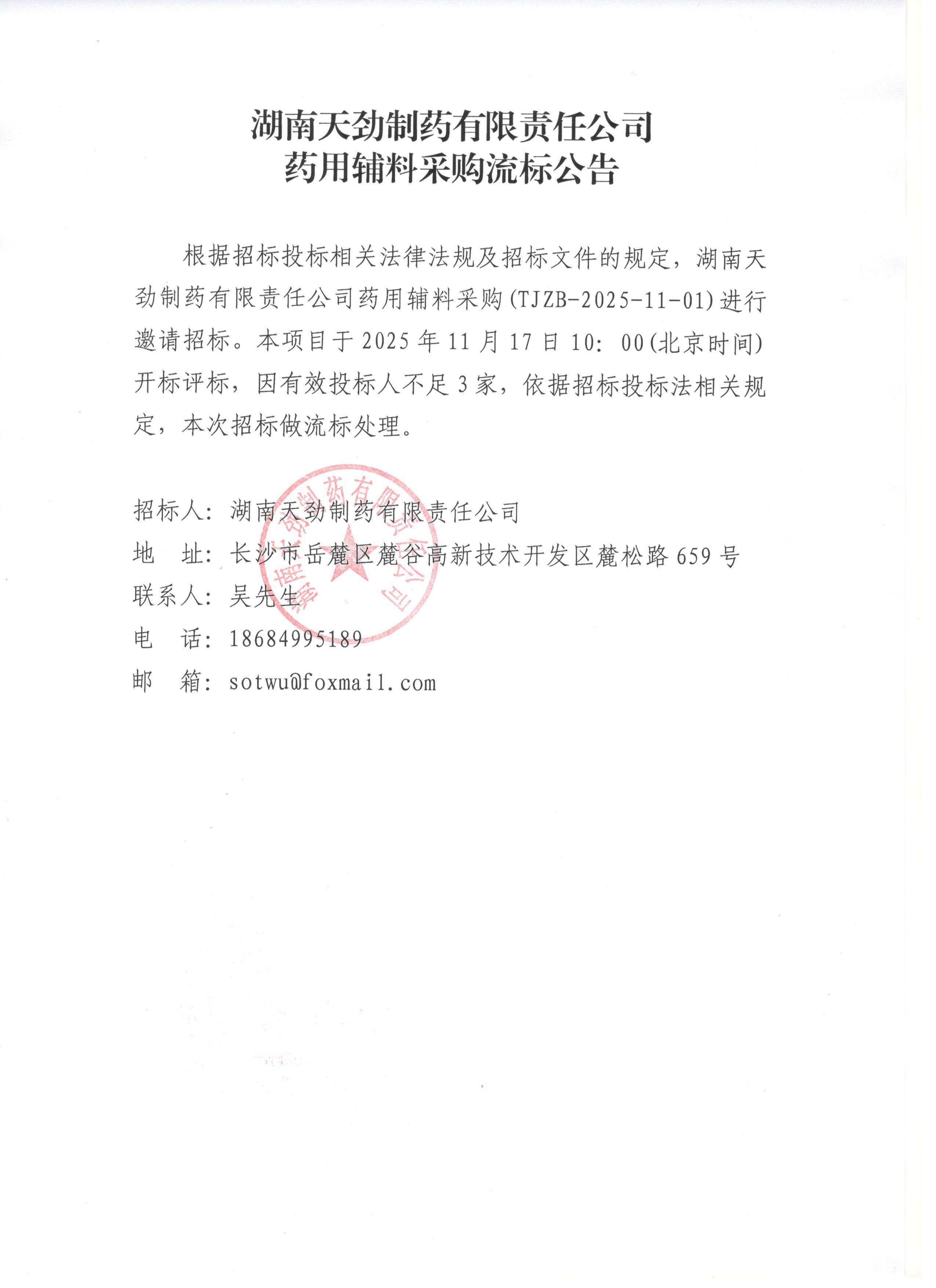 湖南天劲制药有限责任公司药用辅料采购流标公告