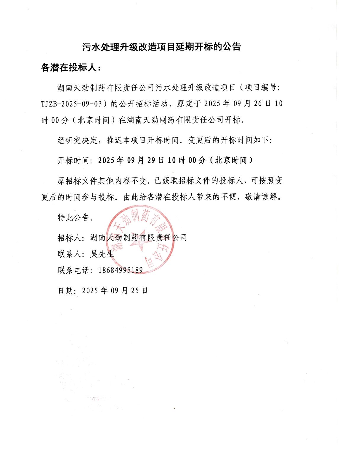 湖南天劲制药有限责任公司污水处理升级改造项目中标候选人公示