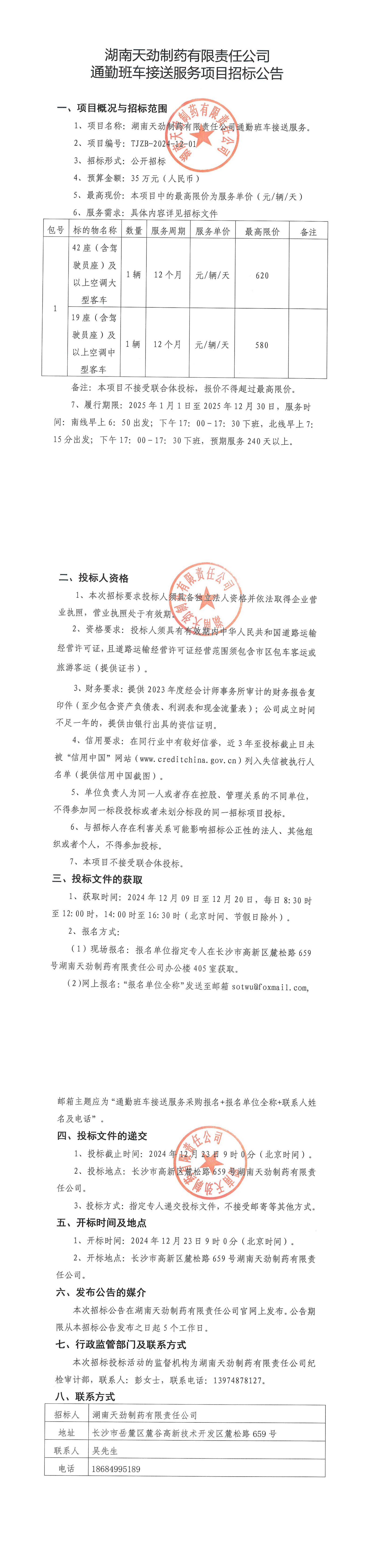 湖南天劲制药有限责任公司通勤班车接送服务项目招标公告