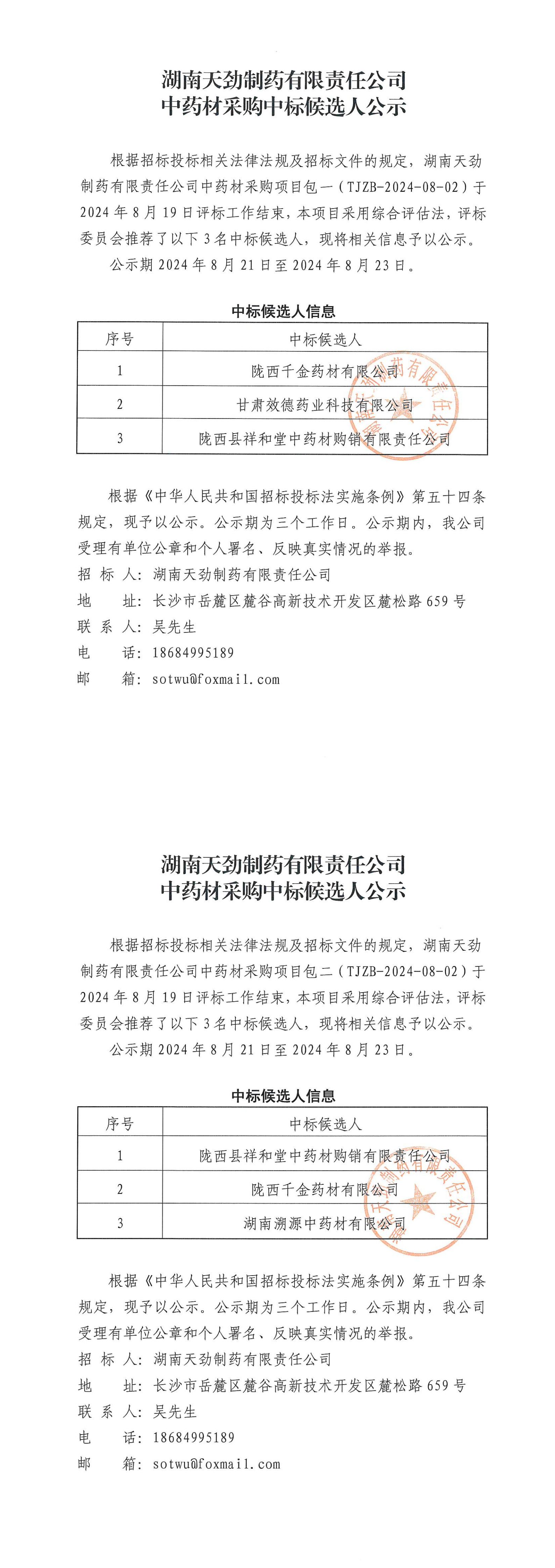 湖南天劲制药有限责任公司中药采购中标候选人公示