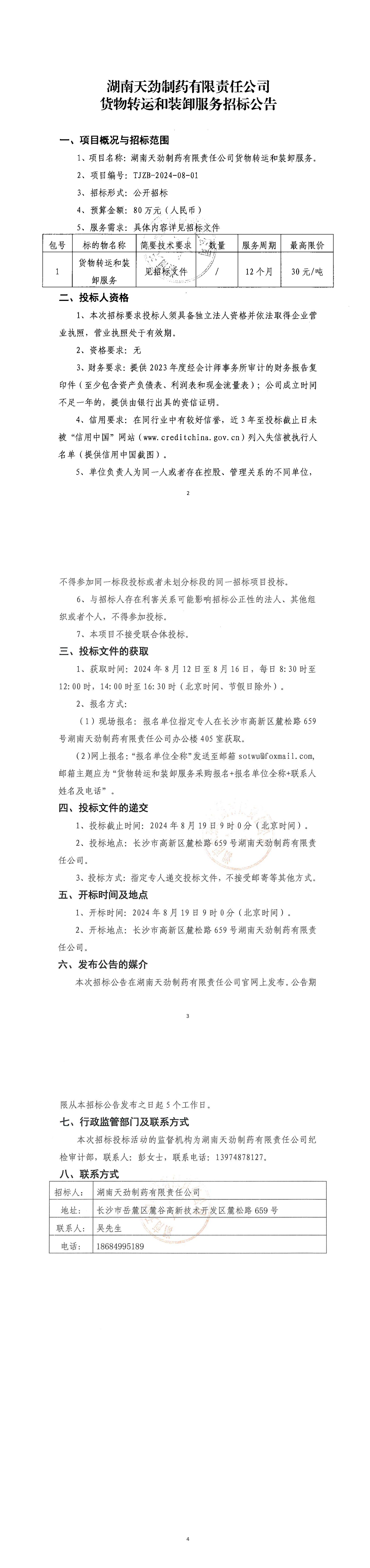 湖南天劲制药有限责任公司货物转运和装卸服务招标公告
