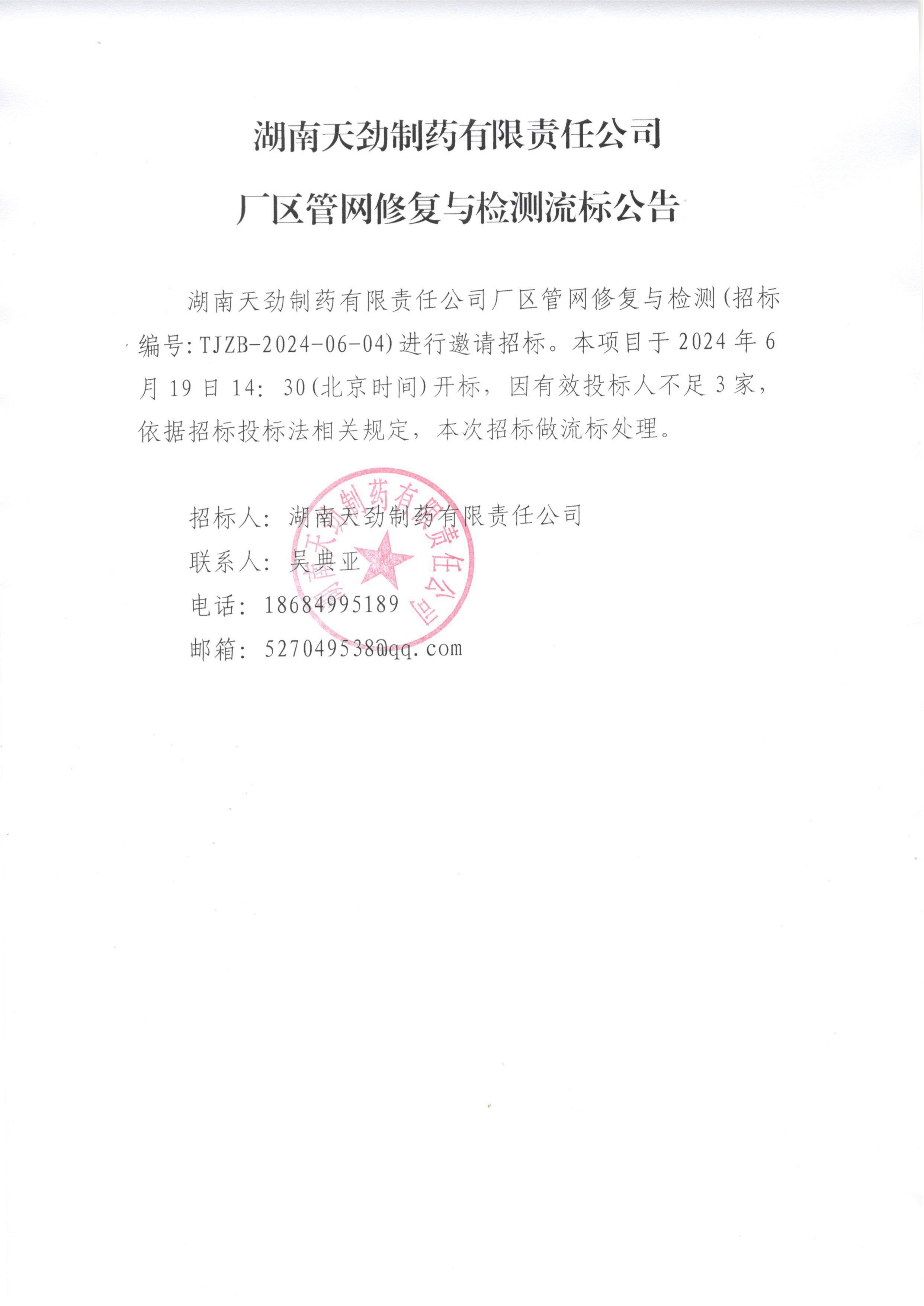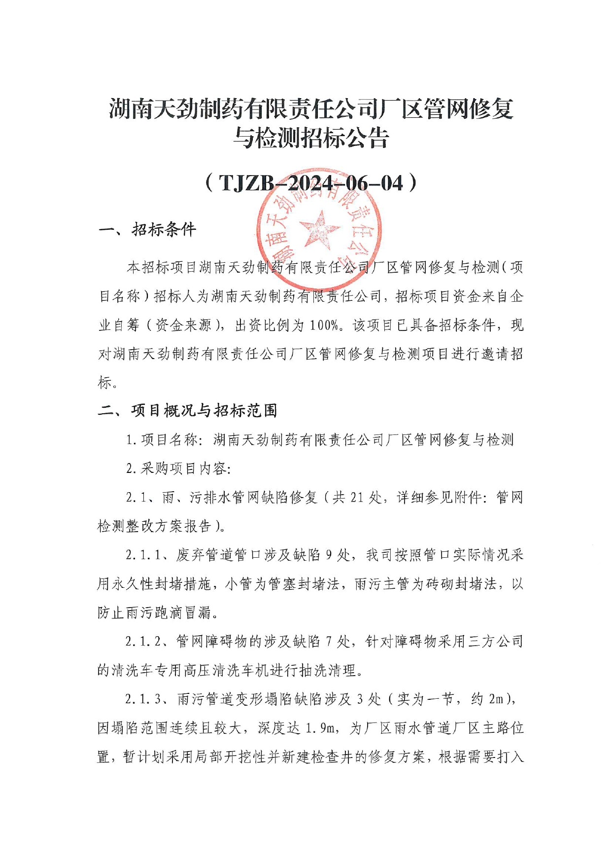 湖南天劲制药有限责任公司厂区管网修复与检测招标公告(TJZB-2024-06-04)