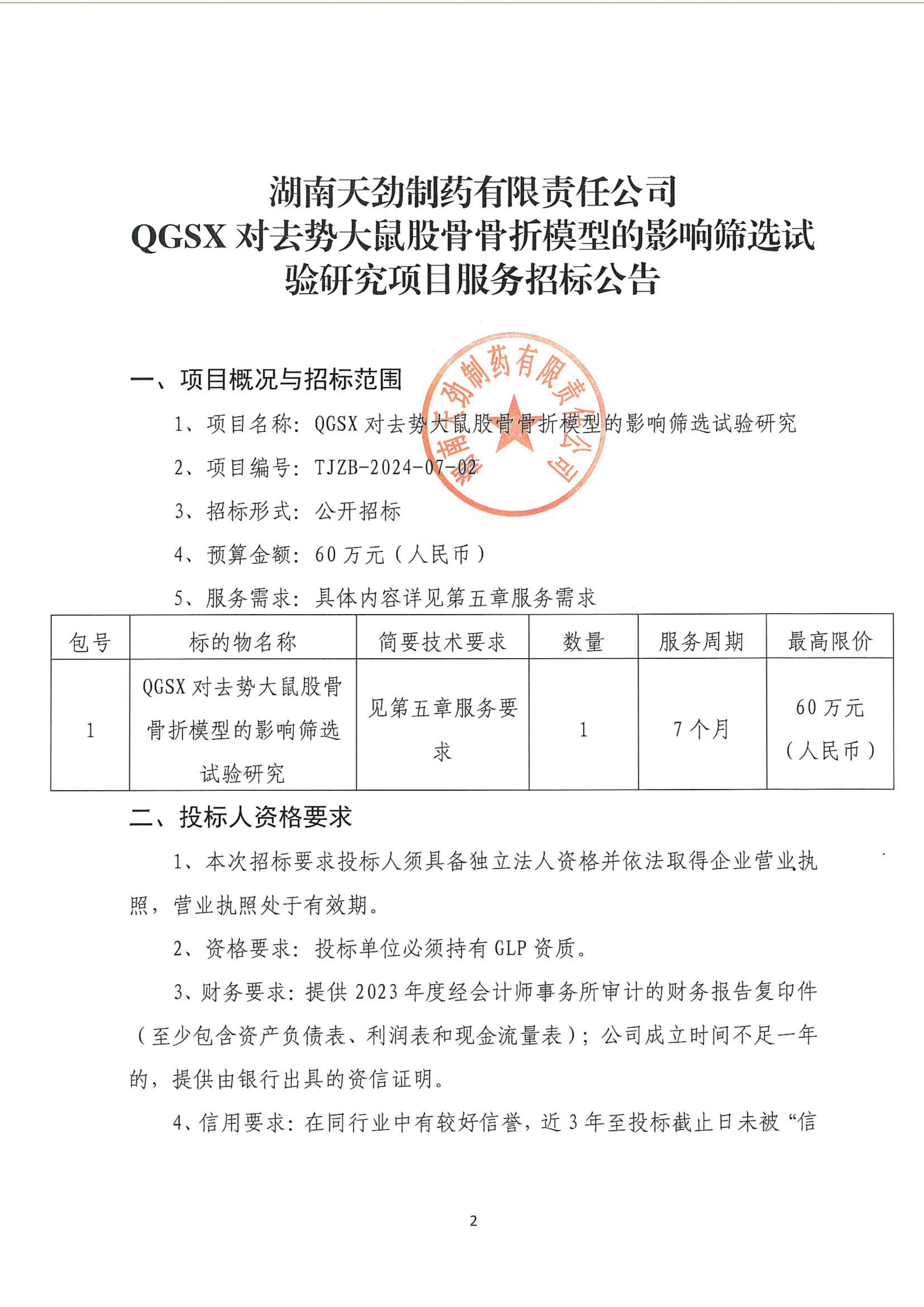 湖南天劲制药有限责任公司OGSX对去势大鼠股骨骨折模型的影响饰选试验研究项目服务招标公告