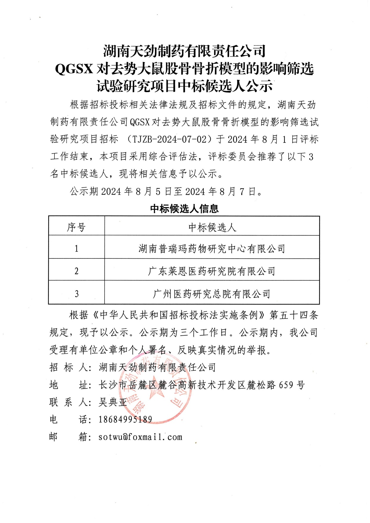 湖南天劲制药有限责任公司OGSX对去势大鼠股骨骨折模型的影响筛选试验研究项目中标候选人公示