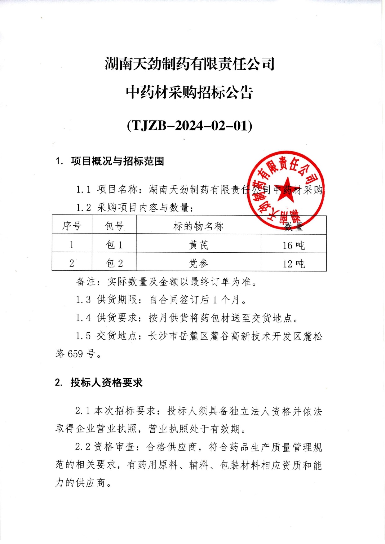 湖南天劲制药有限责任公司中药材采购招标公告 (TJZB-2024-02-01)