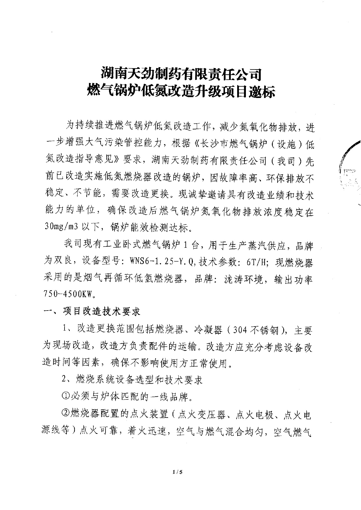湖南天劲制药有限责任公司燃气锅炉低氮改造升级项目邀标