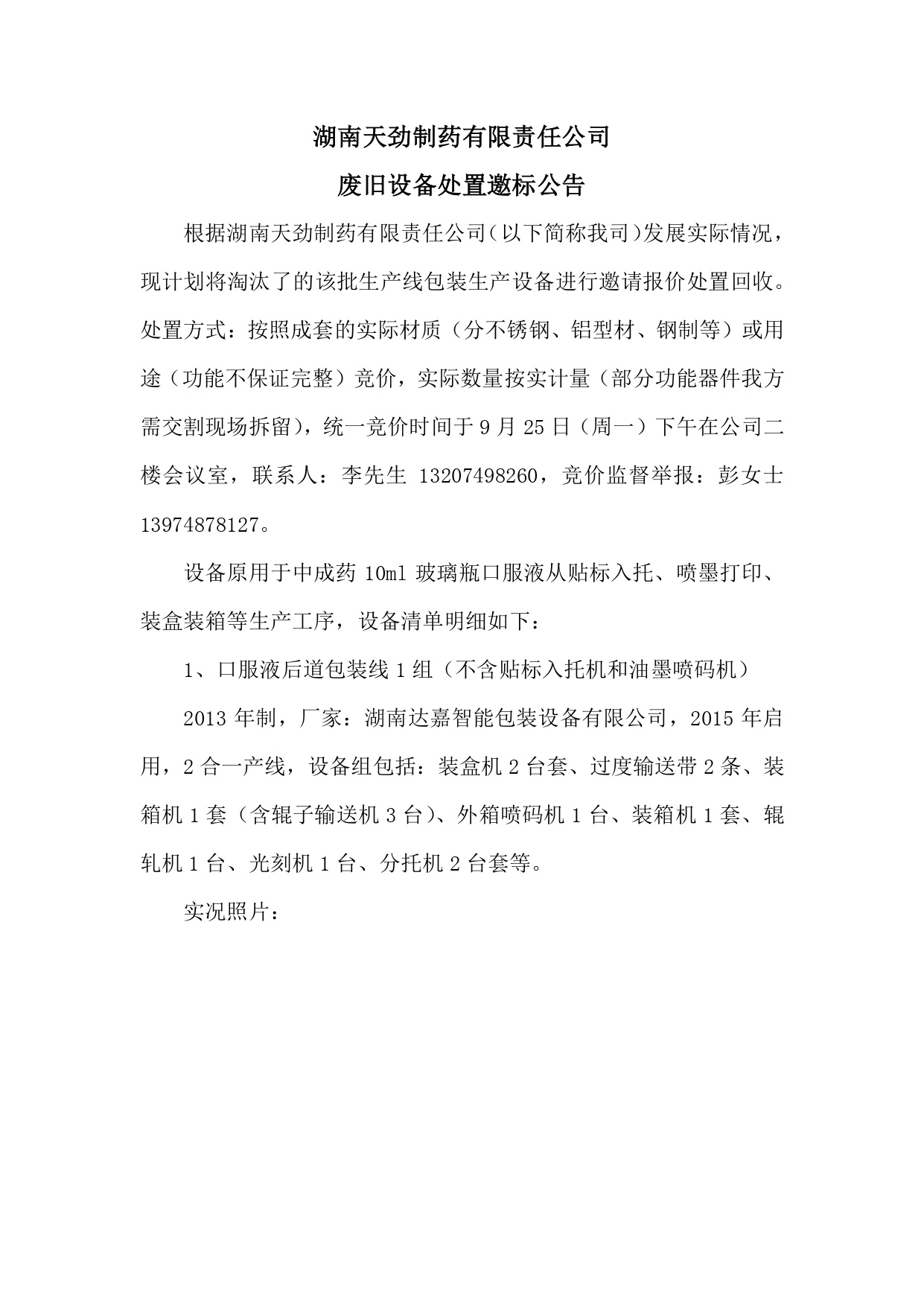 湖南天劲制药有限责任公司 废旧设备处置邀标公告