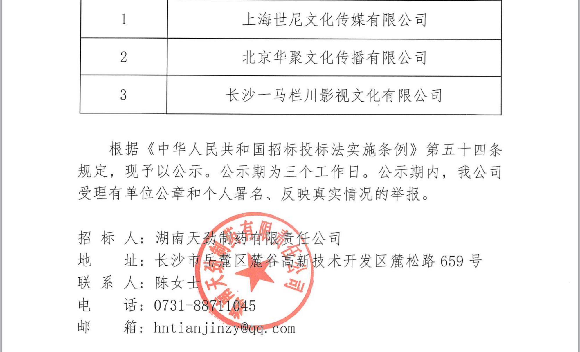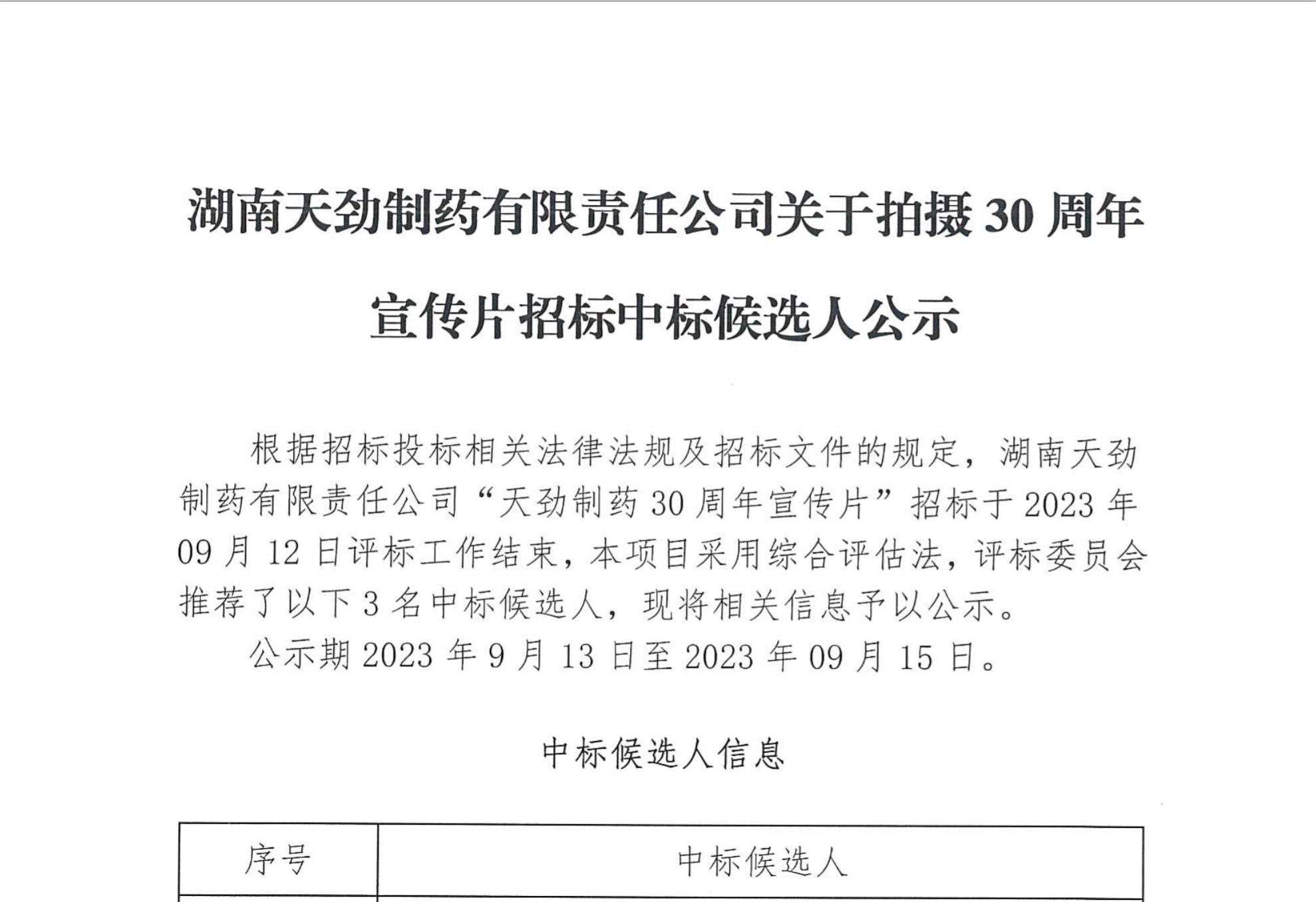 湖南天劲制药有限责任公司关于拍摄30周年宣传片招标中标候选人公示