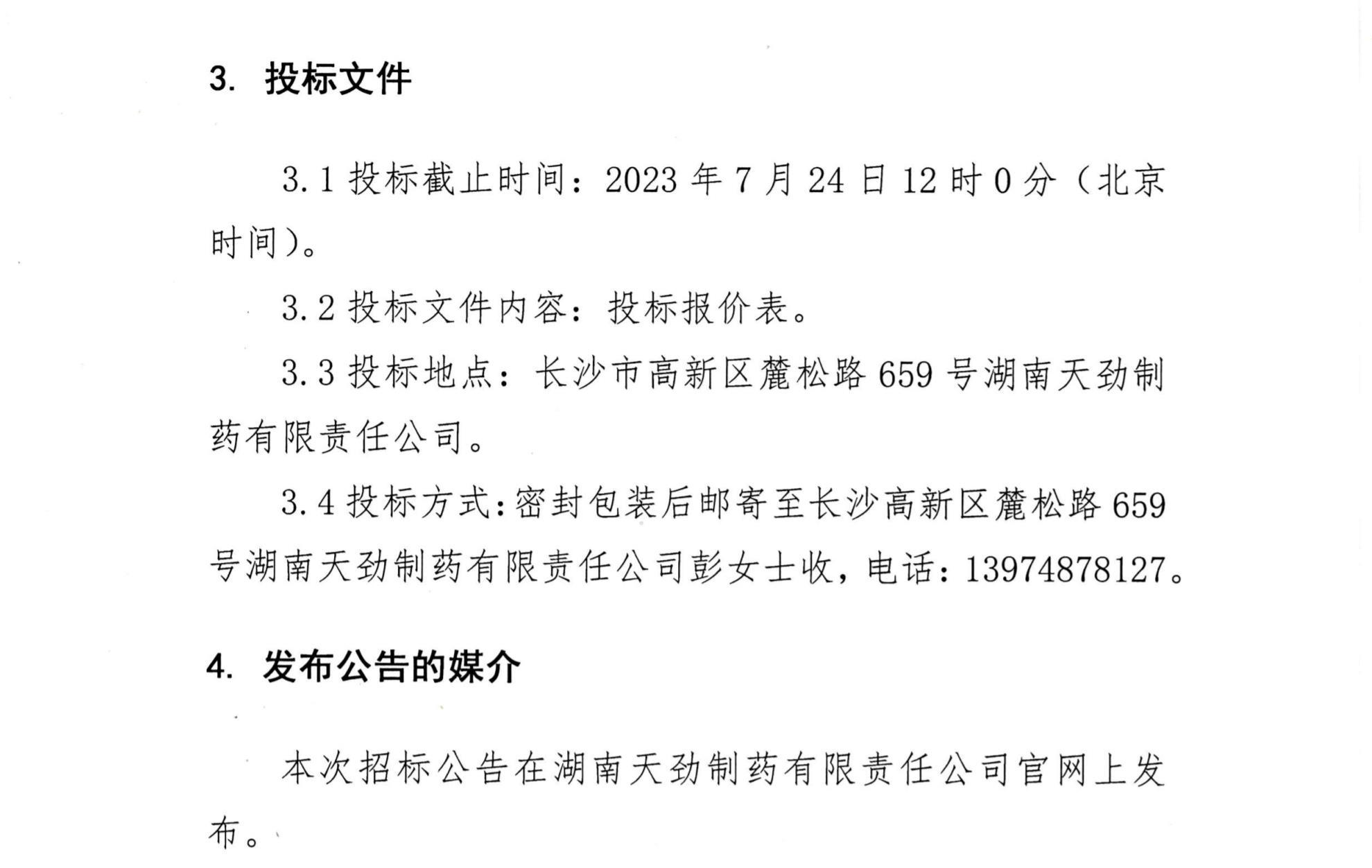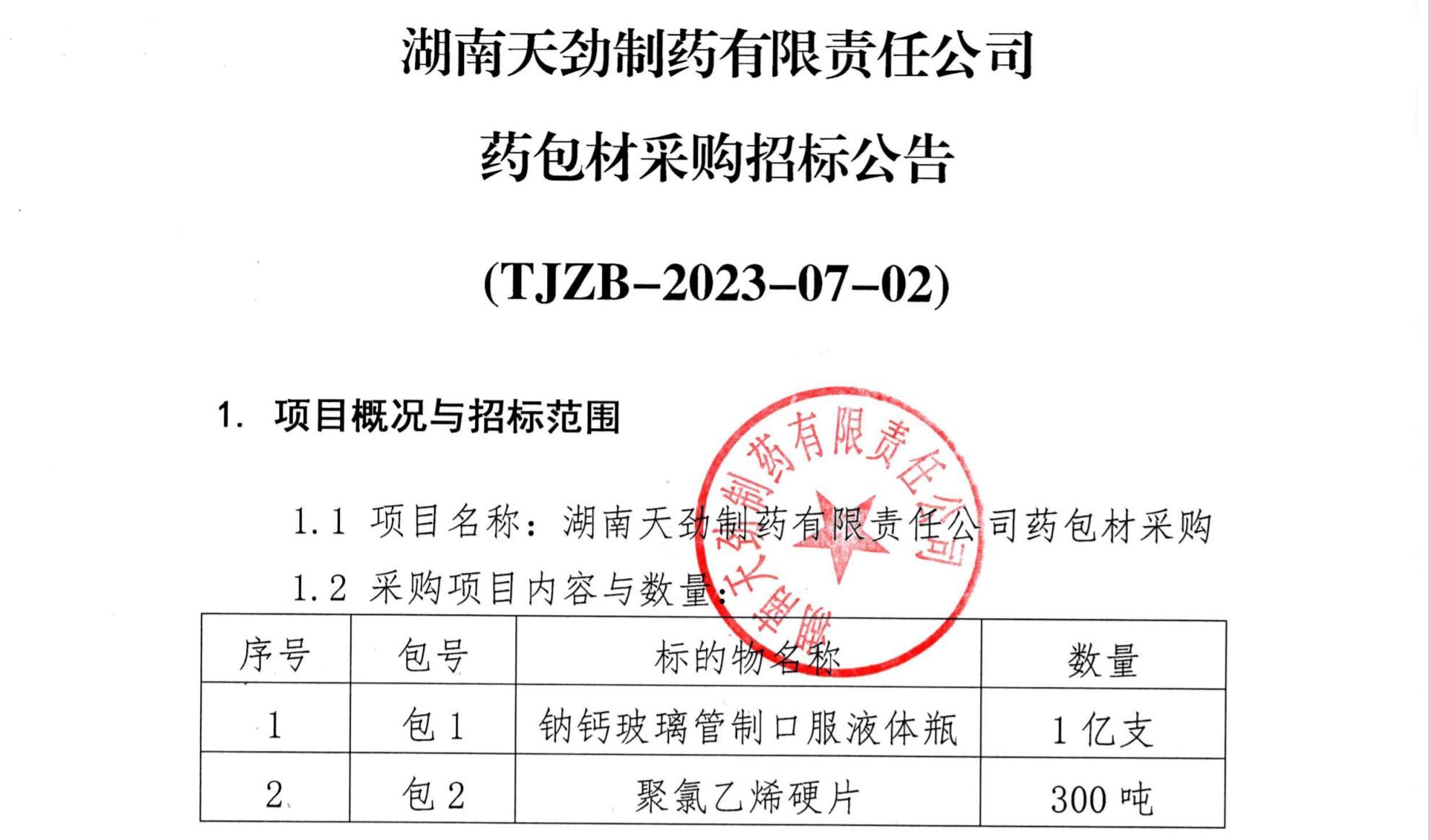 湖南天劲制药有限责任公司药包材采购招标公告