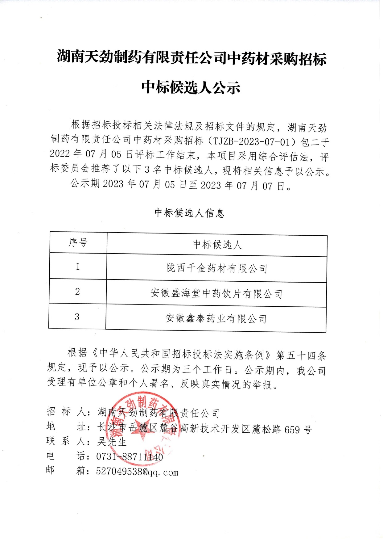 湖南天劲制药有限责任公司中药材采购招标中标候选人公示