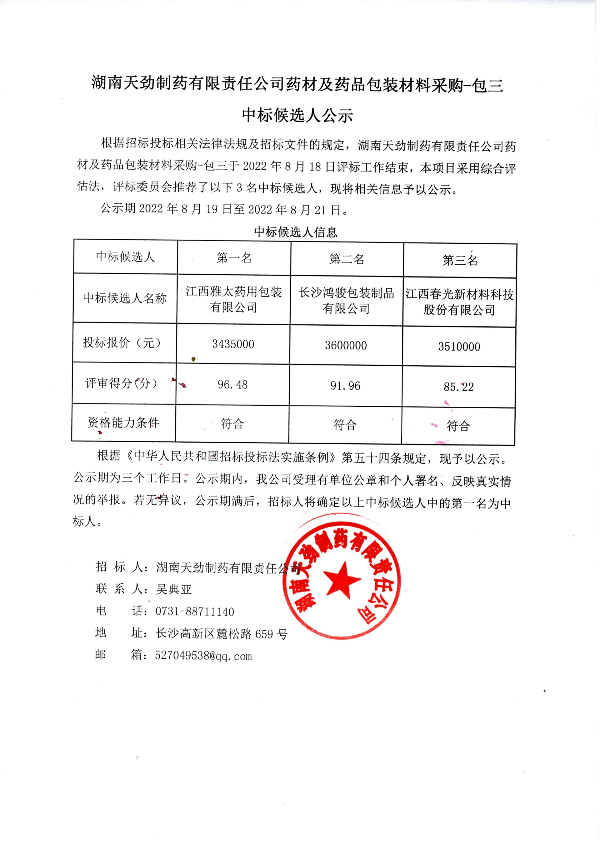 湖南天劲制药有限责任公司药材及药品包装材料采购中标候选人公示