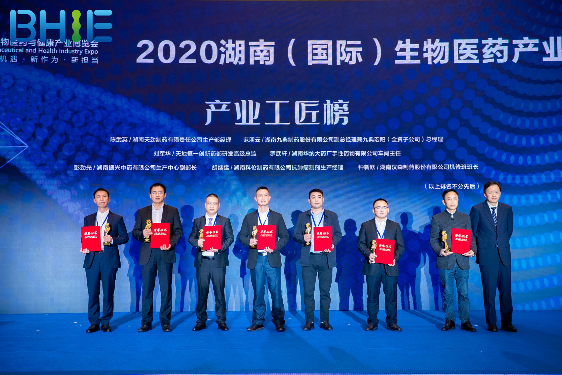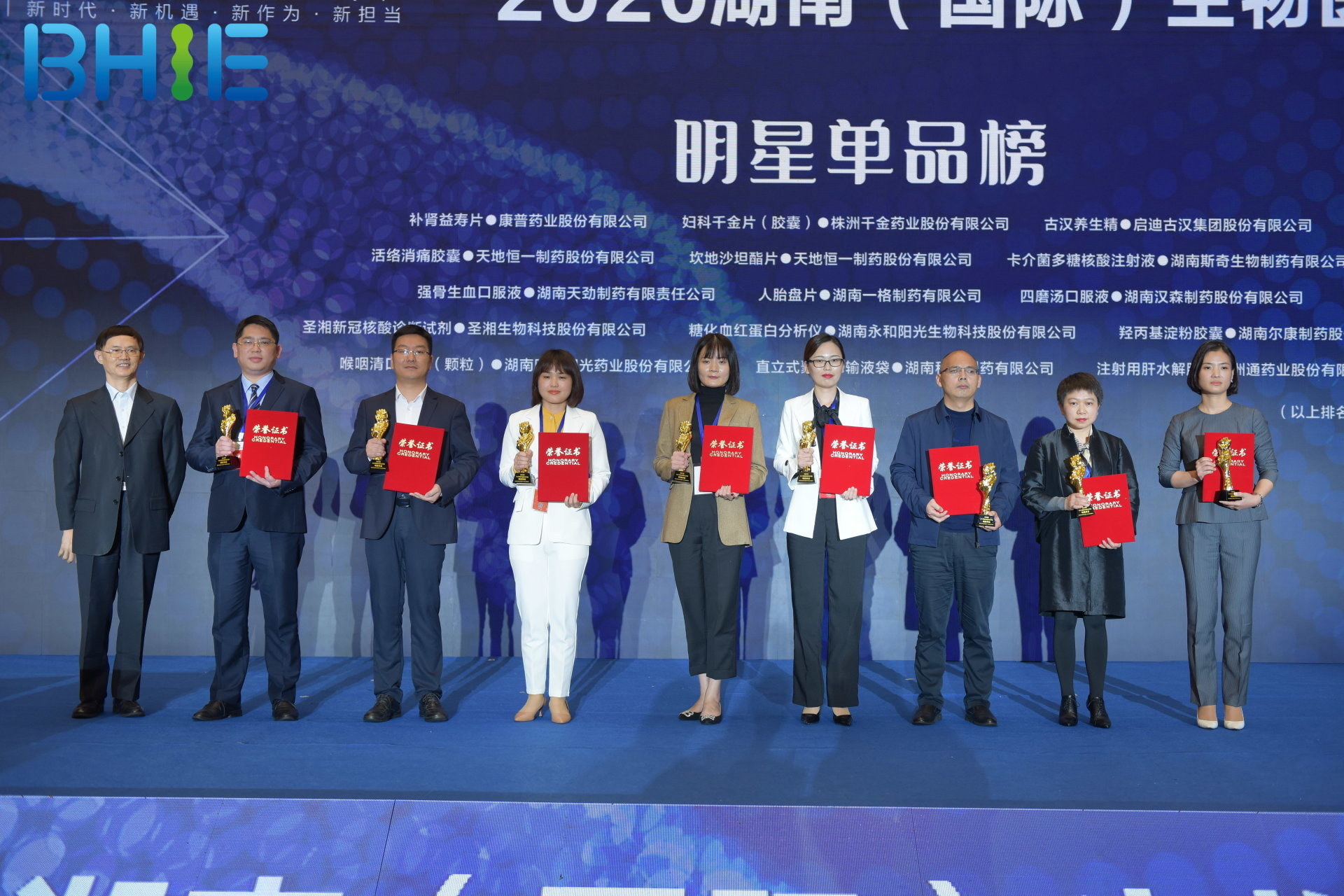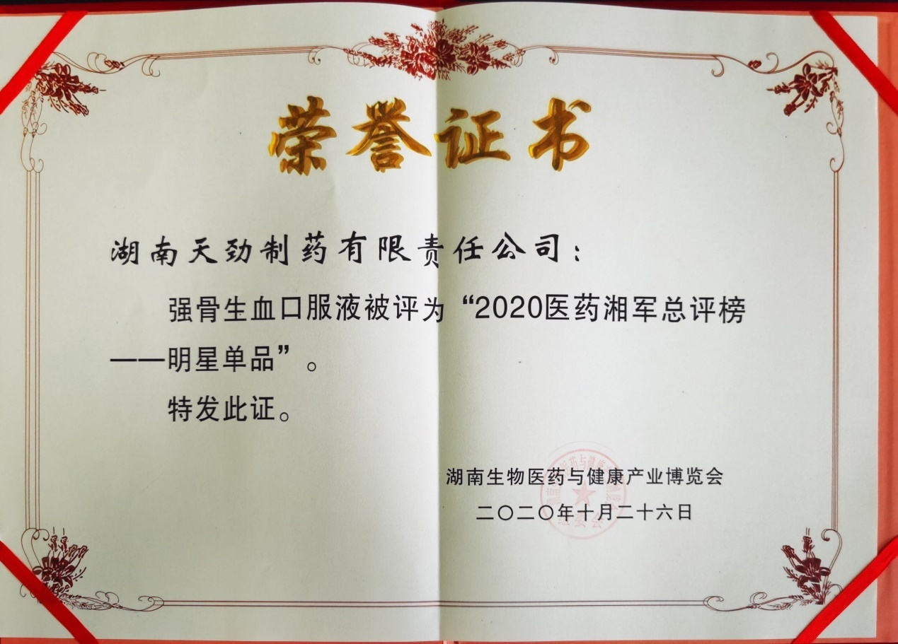 本届博览会突出节约、绿色、创新的理念,在现场设置了沙龙论坛,专家学者、行业大咖面对面交流,为湖南中医药产业抢抓机遇献计献策。大会期间还进行了“2020医药湘军品牌榜”颁奖活动,对生物医药领域做出突出贡献的优秀企业和个人进行了表彰。天劲制药荣获2020“医药湘军总评榜”文化传承先锋称号、公司核心产品强骨生血口服液获“明星单品”奖;天劲制药生产部经理陈武英获产业工匠奖。